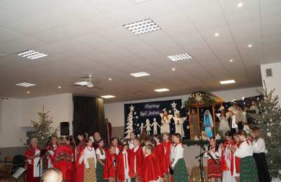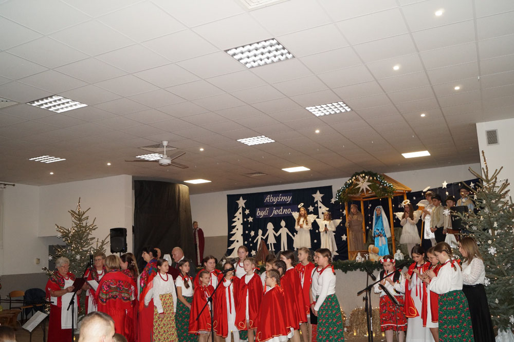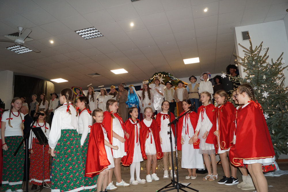 Następnie nasi konferansjerzy: Lena Kromarek i Dawid Krawiec powitali przybyłych gości. Potem głos oddali przedszkolakom z grupy „Żabki”, które zatańczyły „Pastorałkę prosto z nieba”. Natomiast w nastrój betlejemskiej nocy wprowadzili uczniowie z klas trzeciej i czwartej, którzy przedstawili przedstawienie jasełkowe w duchu misyjnym pod hasłem „Abyśmy byli jedno”.