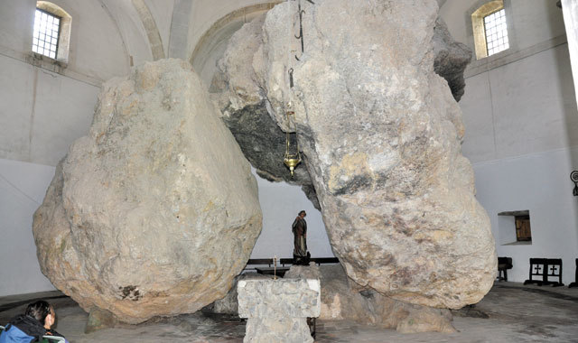 Kiedy wreszcie z tej „górki na pazurki“ docieramy do miasteczka, na samym jego początku czeka nas nagroda: prześliczna sześciokątna kaplica z XVIII w. poświęcona św. Miguelowi Arretxinaga, która niemal w całości jest wypełniona trzema naturalnymi skałami, pod którymi z kolei znajduje się mały kamienny ołtarz i figurka świętego. Ponoć Baskowie doszukują się w tej kaplicy jakichś szczególnych magicznych właściwości, ale nie mamy okazji tego sprawdzić również dlatego, że tuż obok kaplicy stoi Francuz Girard (Pamiętacie? Ten, który wie wszystko najlepiej na temat Camino i nie tylko) i tryumfalnie wskazuje nam budynek obok, w którego oknie na piętrze wdzięczy się para traperek.