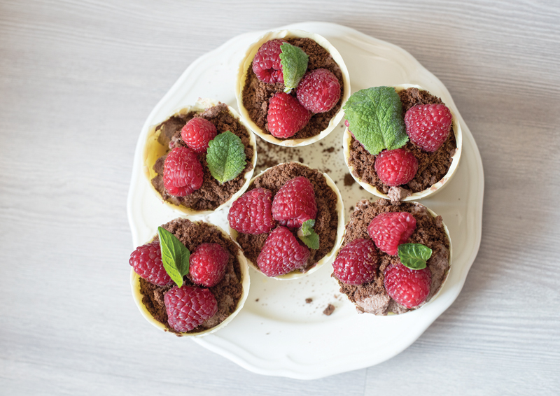 Masło i czekoladę roztapiamy na małym ogniu, ciągle mieszając. Szykujemy 6 papierowych kubeczków i smarujemy ich wnętrze (dno i ścianki) roztopioną masą czekoladową. Po 5 minutach powtarzamy tę czynność. Wstawiamy kubeczki do lodówki na ok. 30 minut, aby czekolada stężała. Po tym czasie rozcinamy nożyczkami kubeczki i wyciągamy delikatnie czekoladowe koszyczki. Ponownie odstawiamy do lodówki. Do lodówki wkładamy na 15 minut również miskę, w której będziemy ubijać krem. Rozdrabniamy ciastka używając np. malaksera. Wyjmujemy miskę z lodówki, wlewamy do niej mocno schłodzoną śmietanę, podzielony na kawałki, mocno schłodzony ser mascarpone, cukier i cukier wanilinowy. Całość ubijamy mikserem do uzyskania konsystencji bitej śmietany. Dodajemy kakao, ponownie miksujemy masę do uzyskania jednolitej masy. Dodajemy maliny, delikatnie mieszamy łyżką. Przekładamy do przygotowanych czekoladowych koszyczków, posypujemy rozdrobnionymi ciastkami.