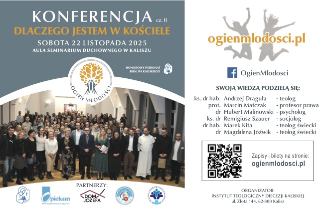 Już wkrótce w Kaliszu ponownie zapłonie „Ogniem Młodości”! Po ubiegłorocznym sukcesie pierwszej edycji, w której uczestniczyło ponad 250 osób, Szkoła Liderów Parafialnych działająca przy Instytucie Teologicznym Diecezji Kaliskiej zaprasza na kolejne spotkanie pełne inspiracji, świadectw i ważnych rozmów.