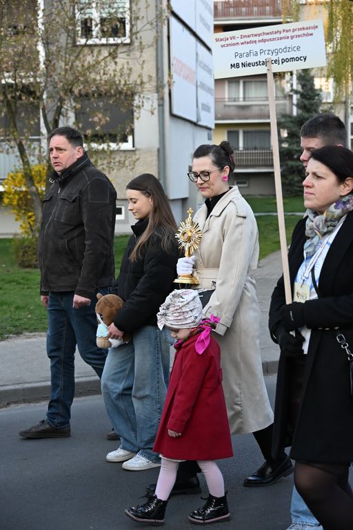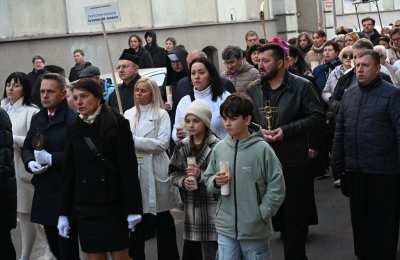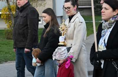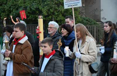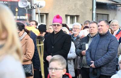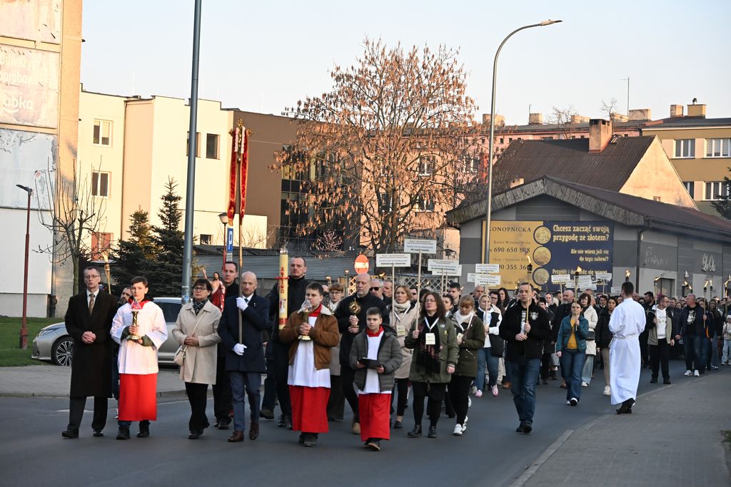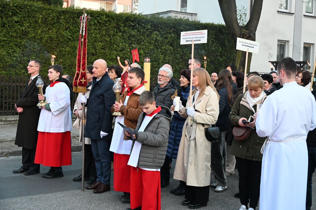 Potem Droga Światła wyruszyła ulicami Ostrowa Wielkopolskiego sprzed konkatedry do sanktuarium Miłosierdzia Bożego. Obok krzyża, paschału i figury Chrystusa Zmartwychwstałego przedstawiciele parafii ostrowskich dekanatów ponieśli relikwie świętych i błogosławionych. Dzięki temu był to czas spotkania ze św. Stanisławem, bł. Michałem Sopoćko, św. Charbelem, św. Małą Arabką, św. Andrzejem Bobolą, bł. Edmundem Bojanowskim, bł. Jerzym Popiełuszką, św. Janem Pawłem II, dziećmi fatimskimi, bł. Hanną Chrzanowską, Krzyżem Świętym, św. Carlem Acutisem, św. Janem Bosko, św. Pawłem od Krzyża, św. o Pio i św. s. Faustyną Kowalską. Przedstawicielom parafii towarzyszyli wspólnota Serce Kecharitomene, Wojownicy Maryi i młodzież. - „Anioł zaś zwracając się do niewiast rzekł: wy się nie bójcie, wiem, że szukacie Jezusa ukrzyżowanego. Nie ma Go tu, zmartwychwstał”. W naszym codziennym życiu też przeżywamy momenty, gdy coś się kończy - relacje, marzenia, plany, na które tak liczyliśmy. Czujemy wtedy smutek, bezradność i myślimy, że nic z tego nie będzie. Zmartwychwstanie Jezusa może oznaczać dla nas odwagę, by zacząć jeszcze raz po niepowodzeniu. Czy potrafię zaufać Bogu, że po trudnych chwilach mogę powstać i iść dalej z nadzieją? – usłyszeli uczestnicy nabożeństwa przy pierwszej stacji.