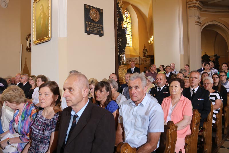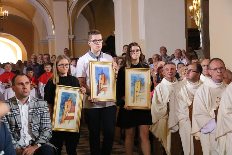 W procesji z darami rodzina bł. bpa Michała Kozala przyniosła relikwie Błogosławionego uroczyście przekazane w katedrze włocławskiej, przedstawiciele Rady Parafialnej wręczyli herby: Watykanu, papieża Franciszka oraz biskupa kaliskiego Edwarda, które zawisną w nowej bazylice, młodzież przyniosła akwarele przedstawiające nową bazylikę, które będą ofiarowane abp. Stanisławowi Gądeckiemu, bp. Edwardowi Janiakowi oraz proboszczowi ks. Aleksandrowi Genderze, ministranci ofiarowali kielich – dar od ks. prałata Adama Modlińskiego, ampułki z winem i wodą oraz patenę z chlebem - dar dla bazyliki od księży posługujących w parafii.