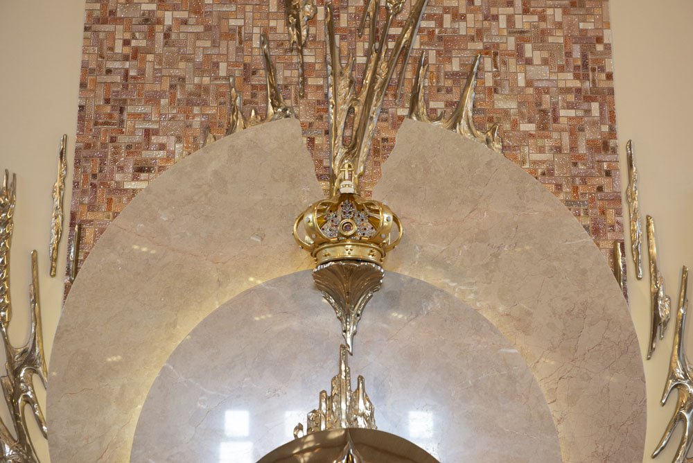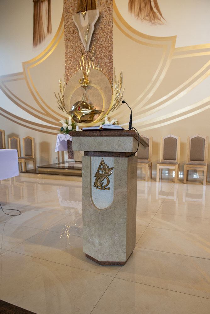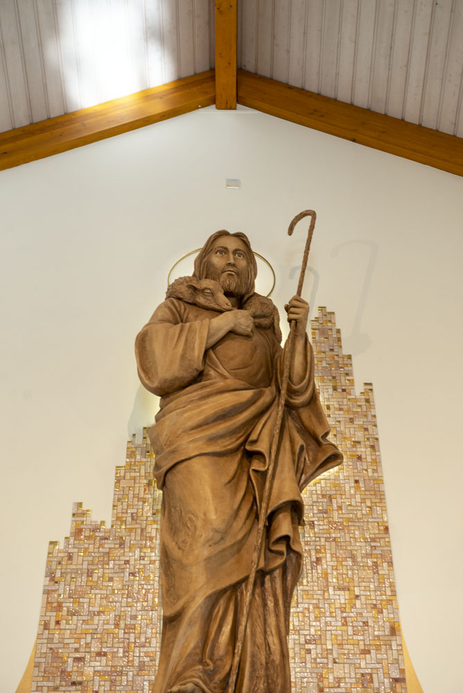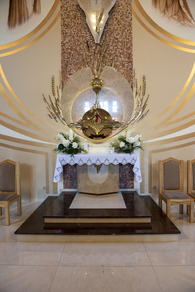 Teraz o najważniejszym miejscu w kościele, czyli prezbiterium. W jego centrum obecny jest Jezus w Najświętszym Sakramencie i o tym przypomina wieczna lampka na złoconym tabernakulum. Kiedy patrzy się na nią, na myśl przychodzi płonień wychodzący z Serca Jezusa. Natomiast z tabernakulum „wyrastają” wykonane z mosiądzu kłosy zboża – symbol Eucharystii oraz korona z relikwiami św. Jadwigi. Nad nimi znajduje się wysoka na trzy i pół metra figura Jezusa Dobrego Pasterza, trzymającego w ręce laskę pasterską i na ramionach owcę, a więc każdego z nas. Nawiązuje ona do ewangelicznej przypowieści o Dobrym Pasterzu. Po prawej i lewej stronie figury Jezusa namalowane zostały postacie św. Jadwigi i św. Jana Pawła II. Od tabernakulum w górę została ułożona mozaika i wykonano malowidła. Znajdujące się w prezbiterium ołtarz, ambona, chrzcielnica, podstawa krzyża, świecznik pod paschał również otrzymały elementy wykonane z mosiądzu, by tworzyły całość z tabernakulum. A światło wpada tu przez dwa witraże.
