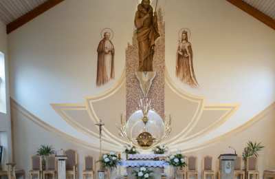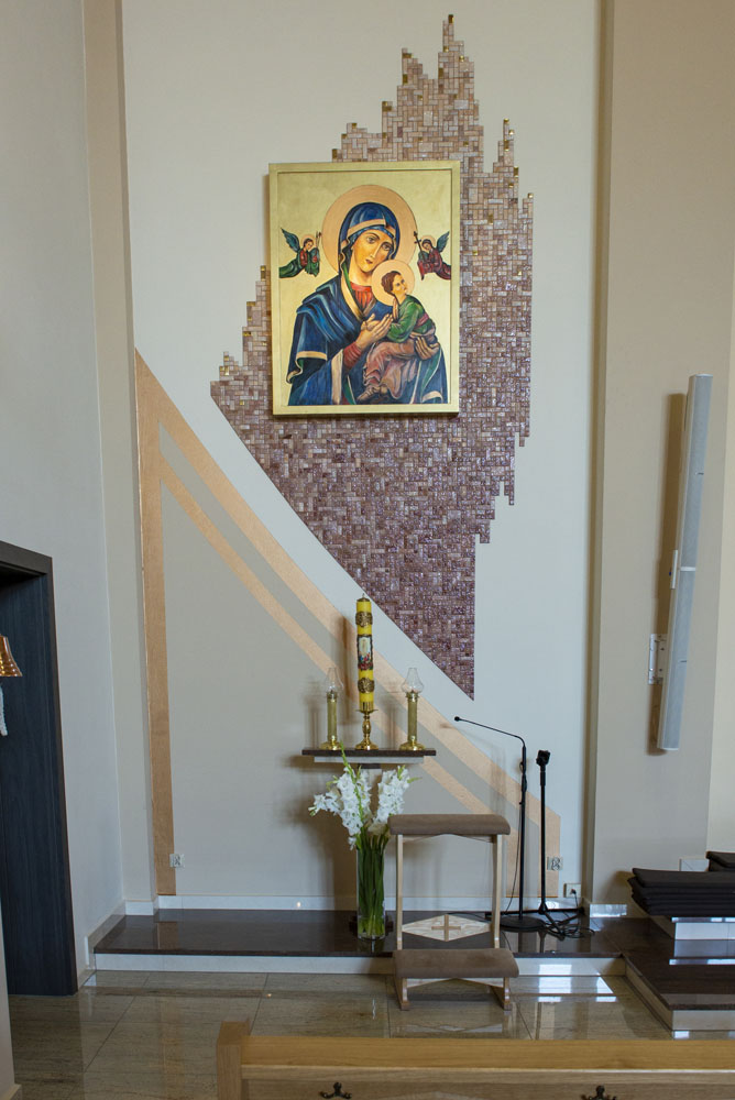 W świątyni umieszczono ołtarze boczne. Ten z lewej strony nawy otrzymał ikonę Matki Bożej Nieustającej Pomocy, a ten z prawej Świętej Rodziny. Ołtarze ozdobiono mozaiką i malowidłami identycznymi jak na ścianie prezbiterium, by tworzyły całość. Naprzeciwko nich zobaczymy emporę muzyczną, na której bez problemu zmieści się schola, chór i w przyszłości piszczałkowe organy. Od południowej strony prezbiterium znajdziemy zakrystię, a w jej sąsiedztwie pomieszczenia pomocnicze, zespół sanitarny, biuro parafialne i salkę dla ministrantów. Do zakrystii i biura parafialnego można wejść również z zewnątrz budynku. Z kolei nad zakrystią, biurem i salką znajduje się probostwo z tzw. domem parafialnym. Natomiast nad kaplicą boczną i jej zakrystią znalazły miejsce salki parafialne wraz z zapleczem.
