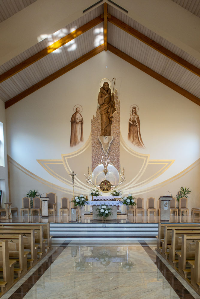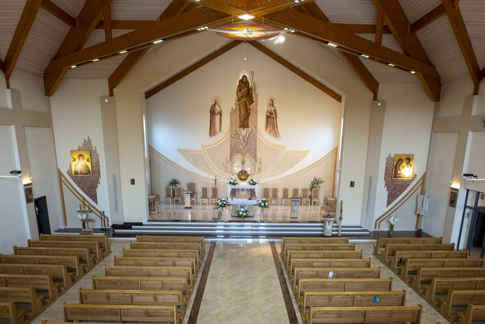 Teraz kilka szczegółów o wnętrzu kościoła, w którym można poczuć się jak w niebie albo jego przedsmak. To wnętrze zostało tak przygotowane, że skłania do modlitwy. Nowoczesność została połączona z pięknem i ciepłą kolorystyką. Każdy szczegół został przemyślany. Główne wejście do świątyni zaopatrzono w kruchtę, która osiowo łączy się z nawą główną zaprojektowaną w kształcie kwadratu, powiększonego o miejsce, gdzie obecnie powstaje kaplica spowiednicza. Nawa w najwyższym punkcie ma 13,5 metra, a kiedy spojrzymy do góry zobaczymy w tym miejscu przedstawienie gołębicy symbolizującej Ducha Świętego. Tuż obok nawy znajduje się boczna kaplica, oddzielona od reszty kościoła szklanymi drzwiami. Do niej przeniesiono to, co znajdowało się w kaplicy służącej parafii przed wybudowaniem kościoła. Na jej ścianach umieszczono trzymetrowy drewniany krzyż z pasyjką, ikonę Matki Bożej Nieustającej Pomocy, obrazy św. Jadwigi, Świętej Rodziny i Jezusa Miłosiernego, a niedaleko ołtarza figurę św. Józefa.