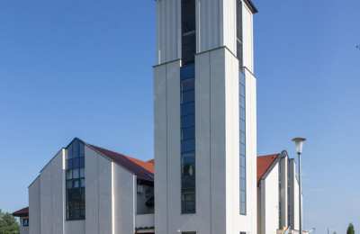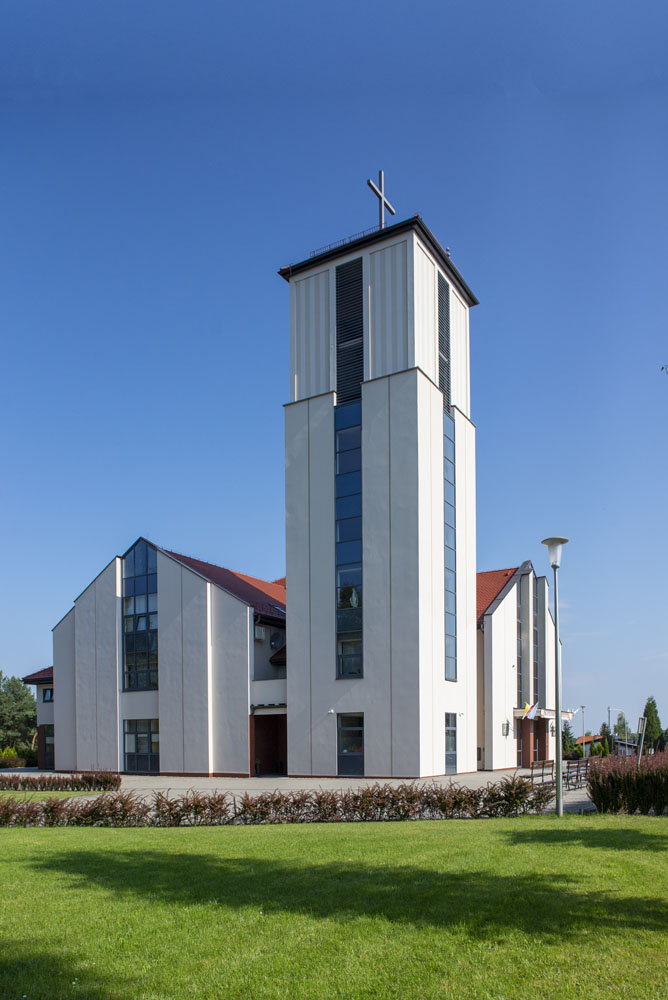 Kiedy przyjrzymy się kościołowi z zewnątrz zobaczymy, że część działki, na której został zbudowany, charakteryzuje się sporym zróżnicowaniem wysokości terenu. Na wyższej części działki znajduje się jego część z wejściem głównym i wysoka na 25 metrów wieża z dzwonnicą, na której zawieszono dzwon noszący imię Jana Pawła II. Na szczycie świątyni, wybudowanej na planie krzyża greckiego, umieszczono pięciometrowy, oświetlony krzyż, widoczny z całego miasta, szczególnie w nocy lub po zmroku.