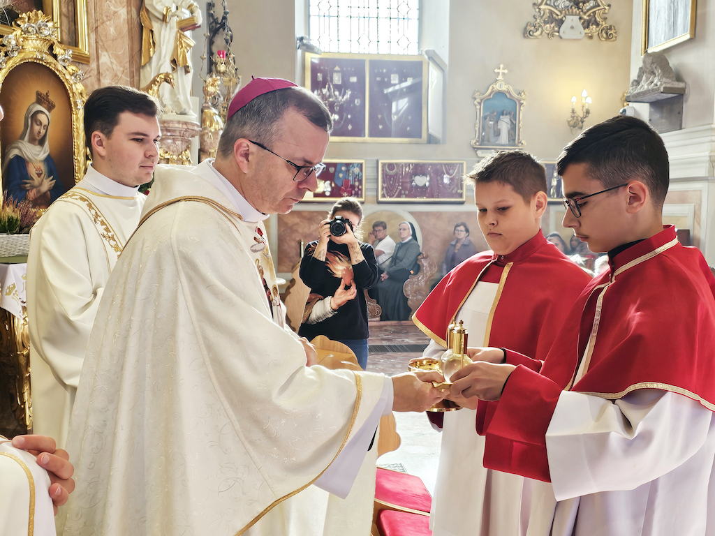 Zostawił ministrantom trzy słowa. Pierwsze to modlitwa. – Wypełniając swoją funkcję jesteście blisko Pana Jezusa. Bardzo chciałbym prosić was, żebyście byli swoim sercem blisko Niego, żebyście dbali o waszą osobistą modlitwę w kościele, ale także w domu – podkreślał pasterz Kościoła kaliskiego. Drugie słowo to braterstwo. – Ministrant służy we wspólnocie. Chciałbym, żebyście dbali o to, aby pięknie i w zgodzie żyć między sobą. Ten, który służy obok mnie, jest dla mnie kimś ważnym. Chcę go uszanować, a jak jest potrzeba to jestem gotów, żeby mu pomóc – mówił celebrans. Trzecie słowo to służba. – Chciałbym zaprosić do ducha służby najpierw w parafii przy ołtarzu, ale potem także w domu. Ważne jest, aby być gotowym do służby przy ołtarzu, ale także gdy jesteście w domu ze swoimi najbliższymi, by pomagać swoim braciom, siostrom, rodzicom, czy też w szkole – zaznaczył bp Bryl.