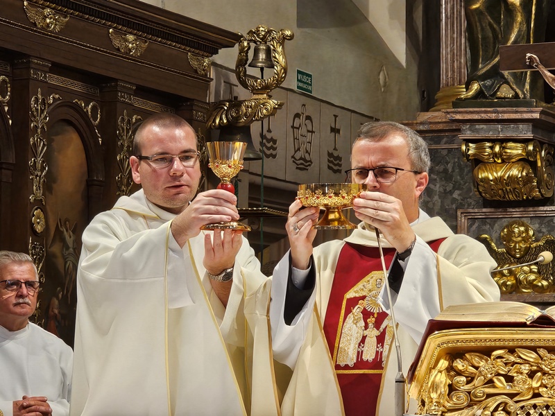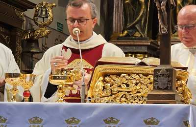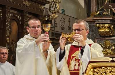 Trzecie słowo to relacja. - Ważne jest, żebyśmy troszczyli się o nasze osobiste spotkania z Chrystusem eucharystycznym. Ta troska o relacje z Chrystusem eucharystycznym pomaga nam potem kształtować nasze inne relacje. Jeżeli jesteśmy blisko Jezusa eucharystycznego to będziemy umieli budować dobre, zdrowe, piękne, twórcze relacje z innymi w naszych domach, miejscach pracy – stwierdził pasterz Kościoła kaliskiego. Czwarte słowo to służba. - Chciałbym, żebyście w świadomy sposób otwierali się na Bożą miłość, medytowali Jego słowo, skonfrontowali się z tym słowem, ale też na miarę naszych możliwości angażowali się, żeby służyć Jezusowi obecnemu w Komunii św., Jezusowi obecnemu we wspólnocie Kościoła, ale także Jezusowi obecnemu w siostrach i braciach, którzy mnie otaczają na co dzień - mówił celebrans. Piąte słowo to spójność. - Jan Paweł II mówił o jedności życia, czyli taki sam jestem na Eucharystii, jak potem w zakrystii, jak potem w moim domu rodzinnym, a potem także gdy pójdę do pracy z moimi współpracownikami. Eucharystia ma nas przemieniać, abyśmy w Jezusowym stylu byli w tym świecie - powiedział bp Bryl.
