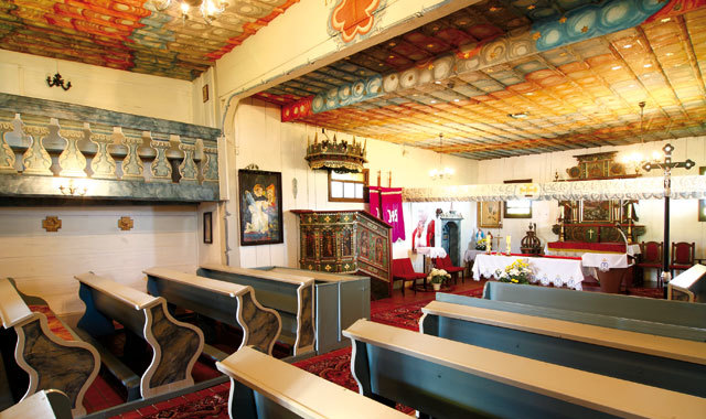 Wnętrze świątyni pokryte jest pięknie odnowioną dekoracją malarską z motywami wici roślinnej i iluzjonistycznie przedstawionym niebem na stropie. Już same drzwi wejściowe witają nas dobrze zachowanymi malunkami imitującymi skośną kratę oraz oryginalnym zamkiem. Wyposażenie jest stylowo jednolite reprezentujące późny renesans. Na szczególną uwagę zasługują ołtarz główny i ambona o bogatej dekoracji z postaciami Świętych Piotra i Pawła oraz czterech ewangelistów. W ołtarzu znajduje się wspominane we wstępie przedstawienie Sądu Ostatecznego, bardzo rzadko występujące na terenie naszej diecezji. Obraz jest dynamiczny, został namalowany w stonowanych barwach. Zastosowano tutaj podział wertykalny, góra z czuwającym Jezusem w czerwonych szatach będących symbolem zwycięstwa oraz dołem przedstawiającym budzących się zmarłych podążających ku zbawieniu lub... straceniu. W mrocznym piekle wystają z płomieni głowy potępionych, a wnikliwe oko dojrzy także samego diabła wciągającego grzesznika ku wiecznemu potępieniu. Trąbiący na trąbach aniołowie w środkowej części obrazu ogłaszają koniec świata.