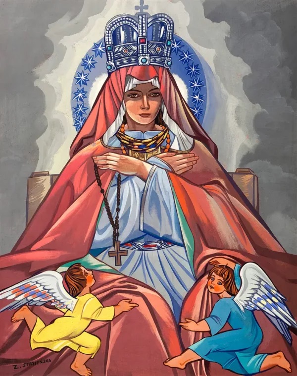 Co więcej, Matka Boża Różańcowa ukazywana jest także jako Orędowniczka wiernych adorowana przez nich i rozdająca im różańce. Takie przedstawienia zyskiwały popularność od końca XV w. Maryja na tychże wizerunkach jawi się jako Opiekunka wszystkich członków Bractwa Różańcowego, wywodzących się z rozmaitych stanów. Bardzo często też ofiarowanie różańca owym wiernym dokonuje się dzięki pośrednictwu św Dominika. Nierzadko również Maryja zasiada na tronie, prawą ręką obejmując stojące na jej kolanach Dziecię, które wręcza owemu świętemu różaniec, a w lewej ręce ów różaniec trzymając. Z 1599 r. pochodzi obraz z kościoła pod wezwaniem św. Jakuba w Sandomierzu, przedstawiający wraz ze świętymi: Tomaszem z Akwinu, Jackiem Odrowążem, Urszulą, Katarzyną i Magdaleną tronującą Maryję z Dziecięciem, trzymającą wraz z Nim różańce; nadto dzierżą je też aniołowie.