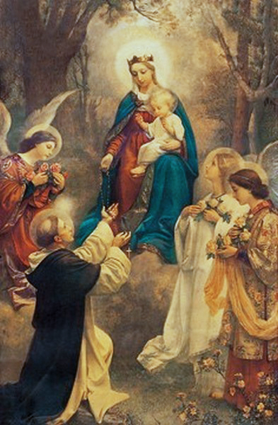 Jednakże znacznie bardziej znane i popularne wydają się przedstawienia Matki Bożej Różańcowej w towarzystwie świętych i błogosławionych. Na pierwszym miejscu w ich gronie należy wymienić św. Dominika, ponieważ to on miał otrzymać od Maryi różaniec i spopularyzować modlitwę różańcową. Dlatego liczne obrazy prezentują Maryję wręczającą różaniec klęczącemu przed nią św. Dominikowi. Rodzime ich przykłady pochodzą z XVII i XVIII stulecia. Przywołana w 1475 r. przez francuskiego teologa Alanusa de Rupe legenda mówi, że Matka Boża, ukazawszy się temu założycielowi Zakonu Kaznodziejskiego i podarowawszy mu różaniec, zachęciła św. Dominika do odmawiania go w celu uczczenia radosnych, bolesnych i chwalebnych tajemnic jej życia oraz poleciła temu świętemu rozpowszechnienie owej formy modlitwy wśród ludzi, obiecując, że w ten sposób pokona on herezję albigensów. To właśnie św. Dominik, który Różaniec nazywał koroną z róż Matki Bożej, jest postrzegany przez tradycję Kościoła i większość autorów dominikańskich jako pierwszy propagator Różańca. Z połowy XVII w. pochodzi malowidło ze sklepienia kaplicy różańcowej przy dominikańskim kościele pod wezwaniem świętych Jacka i Doroty w Piotrkowie Trybunalskim. Uchodząc za jedno z najstarszych, rodzimych przedstawień tego tematu, ukazuje klęczącego przed Maryją św. Dominika. Matka Boża, stojąca na półksiężycu, trzyma, podobnie jak i Dziecię, w ręce różaniec. Wpisana jest w owal utworzony ze sznura paciorków. Przedstawienie dopełniają figuralne sceny z życia Jezusa Chrystusa i Maryi, ukazujące poszczególne tajemnice różańcowe. Niekiedy też nie Maryja, ale mały Jezus bezpośrednio podaje św. Dominikowi różaniec, co może czynić na innych przedstawieniach tylko Matka Boża.