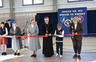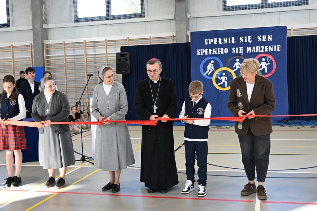 W swoim wystąpieniu ks. biskup wskazał na trzy wartości: wytrwałość, współpracę i rozwój – Powstanie tej sali wymagało dużo cierpliwości, wytrwałości i determinacji – powiedział ks. biskup. Podkreślił, że takie dzieła powstają dzięki zaangażowaniu wielu osób. – Chciałbym bardzo serdecznie wszystkim za to współdziałanie pogratulować i podziękować – podkreślił ks. bp Bryl. Wyraził radość, że dzięki sali będzie można wspierać uczniów w wielowymiarowym rozwoju. - Takie dzieła jak ta sala dzieją się dzięki zaangażowaniu wielu osób, ale my ludzie wierzący wiemy, że potrzeba też Bożego błogosławieństwa. Chcemy pokornie prosić, by Pan Bóg czuwał nad tym miejscem, by było rzeczywiście miejscem rozwoju. Niech ta modlitwa błogosławieństwa będzie wyrazem wdzięczności Panu Bogu i tym wszystkim osobom, które się zaangażowały w powstanie tej sali. Niech będzie też pokornym wołaniem, żeby dobry Bóg czuwał, prowadził i wspierał was – zakończył ks. biskup. Po poświęceniu hali sportowej przez ks. bpa Bryla nastąpiło przecięcie wstęgi. W uroczystości wzięli udział m.in.: s. inspektorka Anna Szczęsna wraz z Radą Inspektorialną, proboszcz parafii św. Antoniego Padewskiego (na jej terenie znajduje się szkoła) ks. prałat Witold Szala, byłe siostry dyrektorki szkoły, przedstawiciele władz samorządowych i oświatowych, projektant sali i jej wykonawca, nauczyciele, absolwenci, uczniowie, rodzice i przyjaciele szkoły. Na ten dzień uczniowie pod kierunkiem nauczycieli przygotowali specjalny program artystyczno-sportowy, między innymi dzieci odtańczyły krakowiaka.