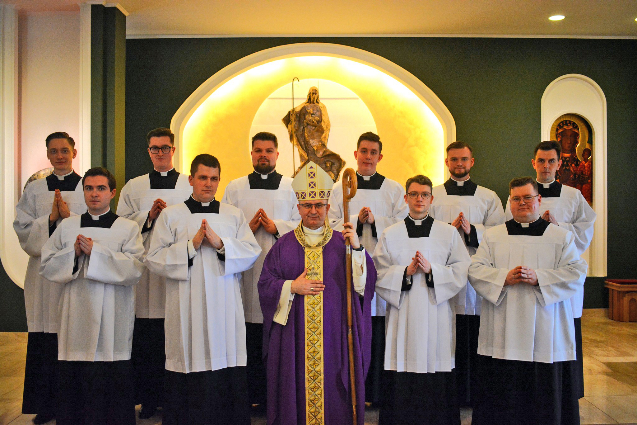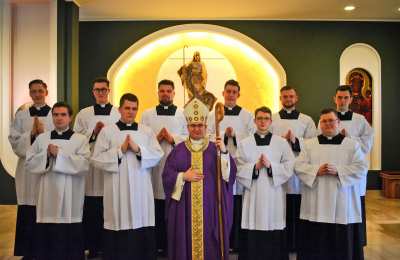 Zwieńczeniem rekolekcji było udzielenie posługi akolitatu naszym dziesięciu braciom, które miało miejsce w III Niedzielę Wielkiego Postu. Akolitat jest to posługa polegająca na pomocy kapłanom podczas liturgii w przygotowaniu ołtarza oraz rozdzielaniu Komunii Świętej. Akolita jest nadzwyczajnym szafarzem Komunii Świętej – może Ją rozdawać podczas Mszy Świętej oraz zanosić chorym. Posługę tę przyjmuje się na czwartym roku formacji seminaryjnej, a w tym roku naszym braciom udzielił jej ks. biskup Radosław Orchowicz, biskup pomocniczy archidiecezji gnieźnieńskiej. Wśród przyjmujących posługę akolitatu było dwóch braci z naszej diecezji: kleryk Jan Matuszak z parafii pw. św. Jana Pawła II w Kaliszu oraz kleryk Martyn Nagorzycki z parafii pw. św. Marcina w Jarocinie. Przyjęcie wspomnianej posługi wiąże się również z dwutygodniowymi praktykami jeszcze przed świętami Wielkiej Nocy oraz miesięcznymi praktykami we wrześniu, które nasi bracia będą odbywać w parafiach i szkołach: kleryk Jan będzie ją pełnił w Diecezjalnym Sanktuarium Bożego Ciała w Nowych Skalmierzycach, a kleryk Martyn w Sanktuarium Miłosierdzia Bożego w Kaliszu. Cieszymy się bardzo z naszych nowo ustanowionych akolitów i życzymy im, aby ta posługa jeszcze bardziej przybliżała ich do Pana Jezusa. Otoczmy ich naszą modlitwą!