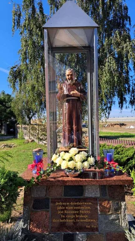 Mieszkańcy pogrzybowskiej parafii modlą się za wstawiennictwem św. o. Pio przy figurze, która przypomina nam przez postać świętego - Pana Boga proszą o wiarę, o pokój i potrzebne łaski dla siebie i bliskich.