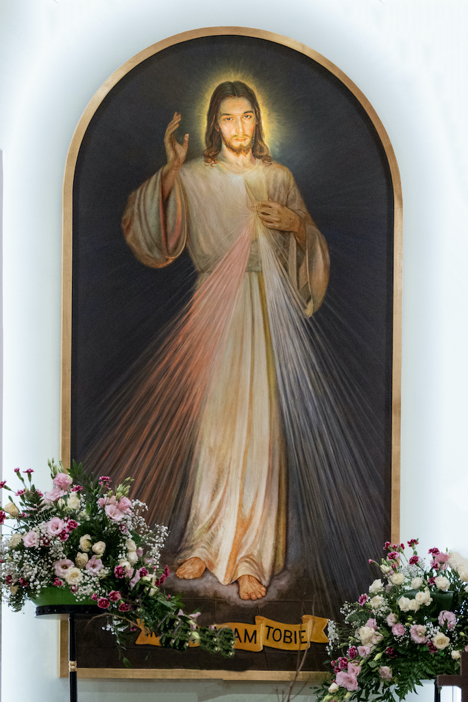 Ponadto na tym obrazie widzisz Jezusa w szacie białej, noszącego na rękach i nogach ślady przebicia w wyniku zadanych ciosów. Ta szata zmartwychwstania, nowego życia jaśnieje pośród twoich ciemności w tle niosąc pewność ufności, że możesz się czuć bezpieczny i pewny Bożej miłości. Chrystus już tu i teraz przez ten obraz przynosi ci światło i moc, pośród ciemności w jakich przychodzi ci czasami żyć (stopy w ruchu). On przynosi ci błogosławieństwo i zachęca na przyjęcie Jego Miłosierdzia, doświadczenie Go i stanie się świadkiem miłosierdzia w tym świecie. Pamiętaj o tym i z ufnością wpatruj się w oblicze Jezusa na tym obrazie, bo On powiedział: „Podaję ludziom naczynie, z którym mają przychodzić do mnie po łaski. Tym naczyniem jest ten obraz z podpisem: Jezu, ufam Tobie” (Dz. 47).