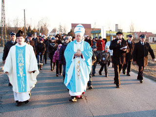 a na misjach przed nawiedzeniem frekwencja była bardzo dobra. Matka Boża zmobilizowała nas jeszcze bardziej. Widać to po dekoracji, która kosztowała parafian sporo wysiłku. Zamarznięta ziemia, a oni wkopali 250 flag – mówił dumny z parafian Ksiądz Proboszcz podkreślając, że przygotowania do nawiedzenia rozpoczęły się dużo wcześniej. - Nasze przygotowanie rozpoczęło się 9 miesięcy przed nawiedzeniem. Od śmierci Papieża każdego drugiego dnia miesiąca o 21 mamy czuwanie w intencji beatyfikacji. Dla nas to był znak Opatrzności, że czuwanie przez ostatnie 9 miesięcy to nie było tylko przygotowanie do beatyfikacji Jana Pawła II, ale i do spotkania z Matką Bożą. Przez ten czas na ołtarzu leżała księga nawiedzenia i każdy parafianin mógł przyjść, wpisać się i w tych intencjach modliliśmy się - powiedział. Bezpośrednio przed nawiedzeniem w parafii odbyły się misje prowadzone przez ojca Jarosława z klasztoru paulinów w Wieruszowie. W momencie powitania Matki Bożej z parafią był ks. bp Stanisław Napierała. - Tylu was się zgromadziło, to jest wyraz waszej wiary. Ta wiara, która tu się wyraża, ona na pewno będzie się umacniać i pogłębiać w spotkaniu z Matką Najświętszą w was obecnych i tych, którzy jeszcze będą przybywać – mówił Ordynariusz do wiernych.