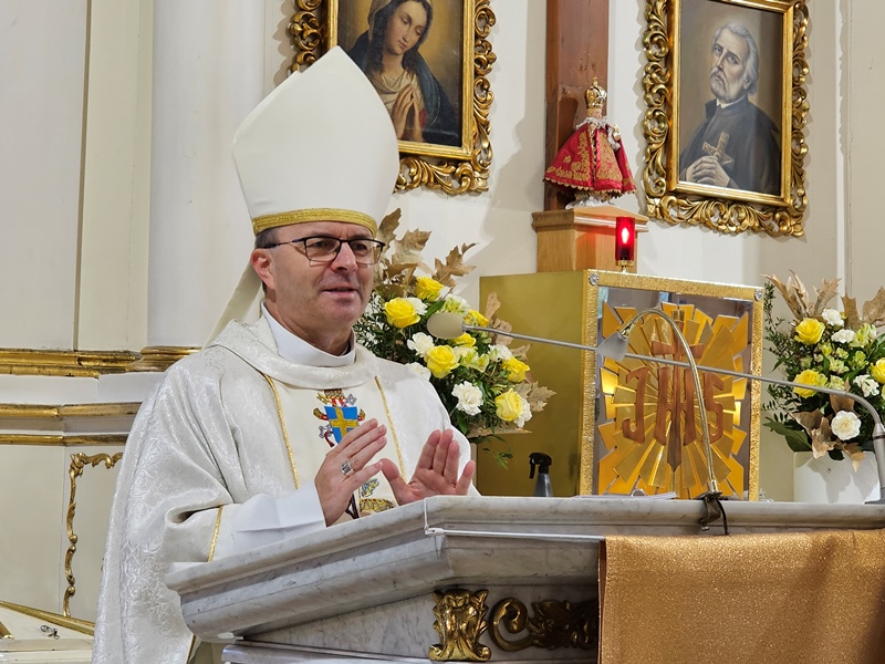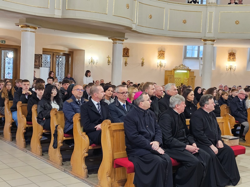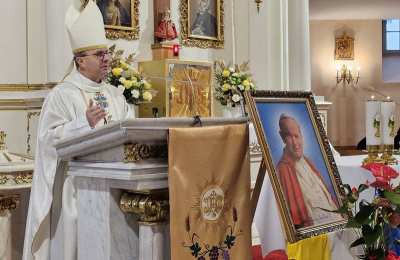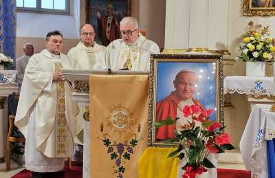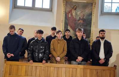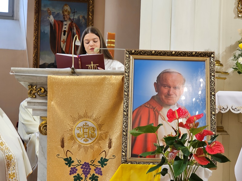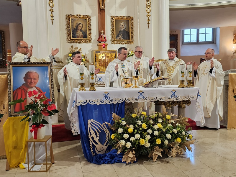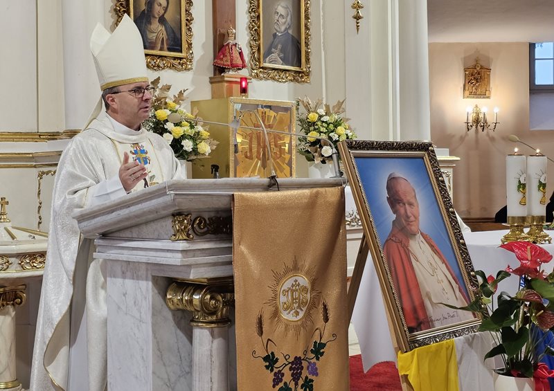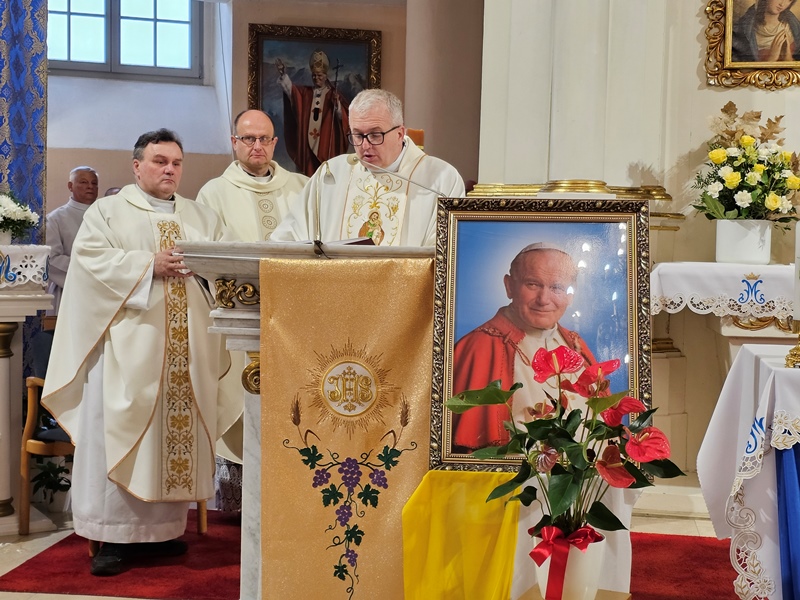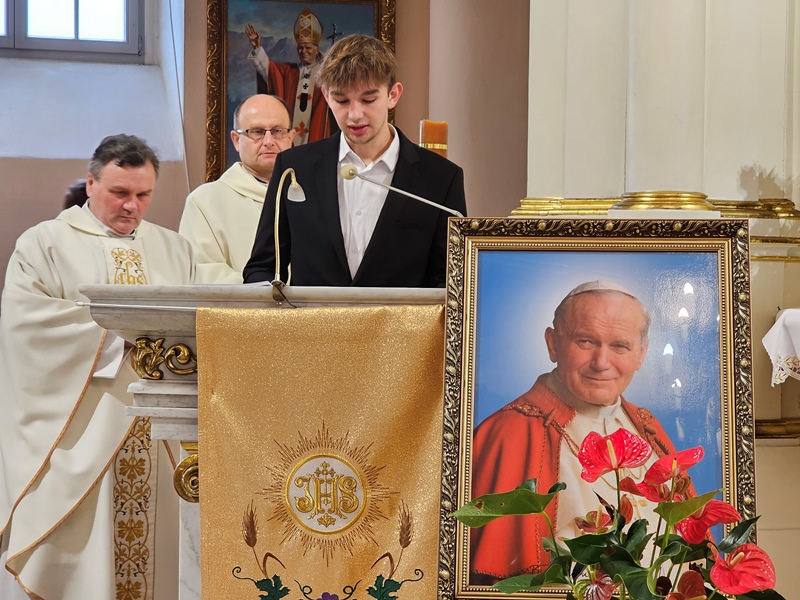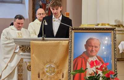 Przed Eucharystią ks. biskup poświęcił przed szkołą pamiątkową tablicę i uczestniczył w ślubowaniu uczniów klas pierwszych. W homilii celebrans zachęcał uczniów, aby na wzór swojego patrona byli autentyczni. - Chciałbym was zaprosić do tego, żebyście dbali o prawdziwość, autentyczność, żebyście nie udawali, żebyście chcieli swoje życie przeżyć mocno, ale w prawdzie bez pozorów – powiedział kaznodzieja. Wskazywał, że Jan Paweł II zachęcał młodych do niesienia Ewangelii innym poprzez świadectwo swojego życia. – „Wyrusz w drogę, nie zadawalaj się dyskutowaniem. Nie czekaj, aby zrobić coś dobrego na okazje, które może nigdy się nie pojawią. Już nadszedł czas działania. Wy młodzi jesteście powołani do głoszenia orędzia Ewangelii świadectwem swojego życia. Kościół, społeczeństwo potrzebują waszej energii, waszego entuzjazmu, waszych młodzieńczych ideałów, aby Ewangelia mogła przenikać w tkankę społeczeństwa. Nie ma czasu, aby się wstydzić Ewangelii. Jest to raczej czas głoszenia jej na dachach” – cytował bp Bryl.