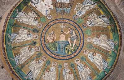 Z pewnością bardziej niż postać Boga Ojca w tej scenie, zdumiewa widok Starca z amforą, z której wypływają wody rzeki. W ikonografii Chrztu Pańskiego ów Starzec z amforą to personifikacja Jordanu. W taki sposób już w starożytności przedstawiano rzeki. Do tej tradycji ikonograficznej nawiązał również barokowy geniusz dłuta, włoski artysta Gianlorenzo Bernini, tworząc Fontannę Czterech Rzek zdobiącą Piazza, czyli Plac Navona w Rzymie, gdzie najsłynniejsze w jego czasach rzeki są personifikowane przez czterech mężczyzn. Starzec jako uosobienie rzeki Jordan widnieje natomiast we wnętrzu dwóch baptysteriów w Rawennie we Włoszech, czyli w budowlach przeznaczonych wyłącznie do udzielania chrztu, stąd ich nazwa wywodząca się ze słowa greckiego oznaczającego chrzczenie. Owe raweńskie budowle to Baptysterium Ortodoksów z V w. i Baptysterium Arian ze VI stulecia. Baptysteria wzniesiono na rzucie ośmiokąta, ponieważ w chrześcijańskiej symbolice ósemka wskazywała na zmartwychwstanie, odrodzenie, nowe życie. Pośrodku sklepienia Baptysterium Ortodoksów personifikujący rzekę Jordan Starzec ukazany został jako zanurzony do pasa w wodzie, z ulistnioną łodygą i dzbanem w ręce. Owa łodyga najprawdopodobniej wskazuje na roślinność porastającą brzegi Jordanu. Nieco inaczej męska personifikacja tej rzeki prezentuje się na sklepieniu Baptysterium Arian. Tutaj uosobienie Jordanu częściowo okryte jest szatą, w prawej ręce trzyma wspomnianą łodygę, za sobą ma amforę, z której wylewa się woda, a z jego głowy wyrastają szczypce kraba nawiązujące do głowy Okeanosa, antycznego tytana i opiekuna morza. Warto też zwrócić uwagę na pewne różnice w wizerunku Świętego Jana Chrzciciela z raweńskich baptysteriów. W Baptysterium Ortodoksów ów ostatni prorok Starego Testamentu wyobrażony został z płaską czarką, z której polewa wodą głowę Mesjasza, a także z dużym krzyżem wysadzanym szlachetnymi kamieniami, natomiast w Baptysterium Arian anonimowy artysta przedstawił go ze zwykłą laską w lewej ręce.