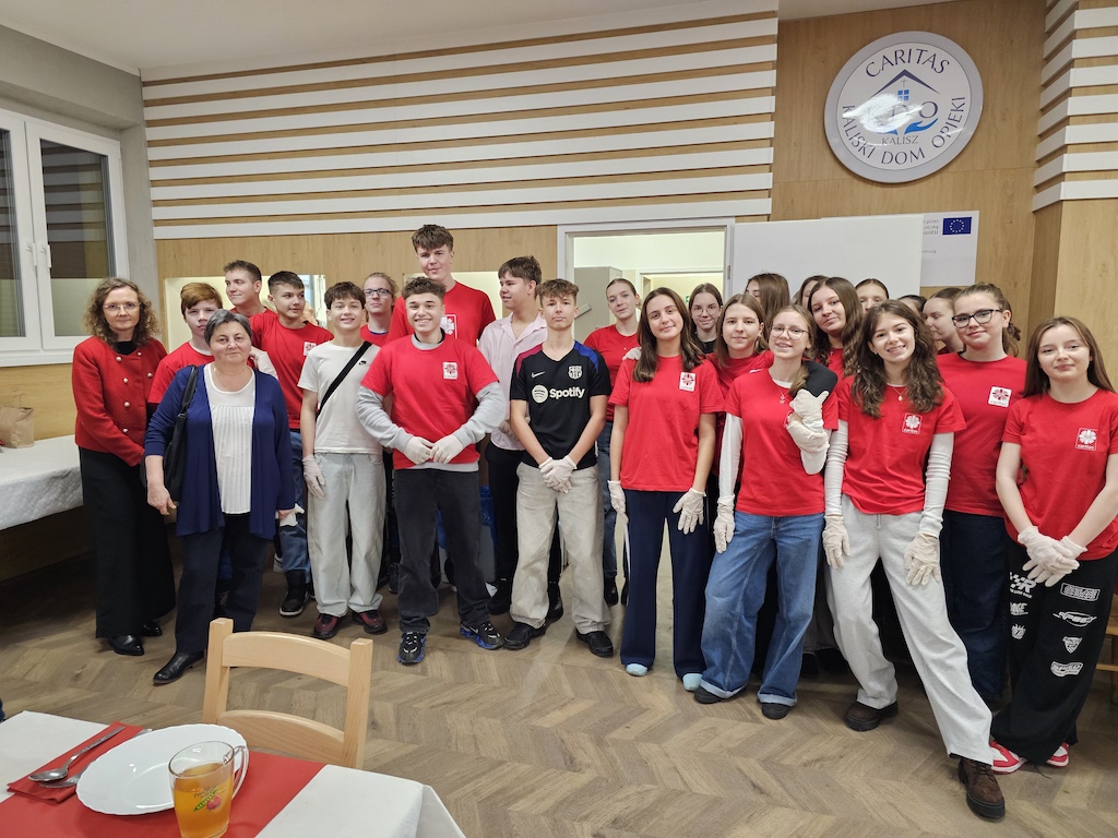 Po przełamaniu się opłatkiem wszyscy zasiedli do wieczerzy. Na stołach zagościły potrawy wigilijne takie jak zupa grzybowa, kapusta z grochem, karp smażony, śledź w oleju, makiełki, sałatka warzywna, kompot z suszu, ciasto. W obsługę zaangażowali się wolontariusze Caritas - młodzież ze Szkoły Podstawowej nr 10 im. Marii Konopnickiej w Kaliszu. Wszyscy podopieczni otrzymali paczki świąteczne, w których znalazły się produkty o przedłużonym terminie przydatności do spożycia. - Za przygotowanie tej wigilii chcielibyśmy podziękować sponsorom, którzy każdego roku nas wspierają. Wśród nich jest firma Selgros. Dziękujemy także lokalnym piekarniom i cukierniom, które nie szczędzą swoich wyrobów – powiedział Paweł Tomczak, kierownik Domu Opieki Caritas.
