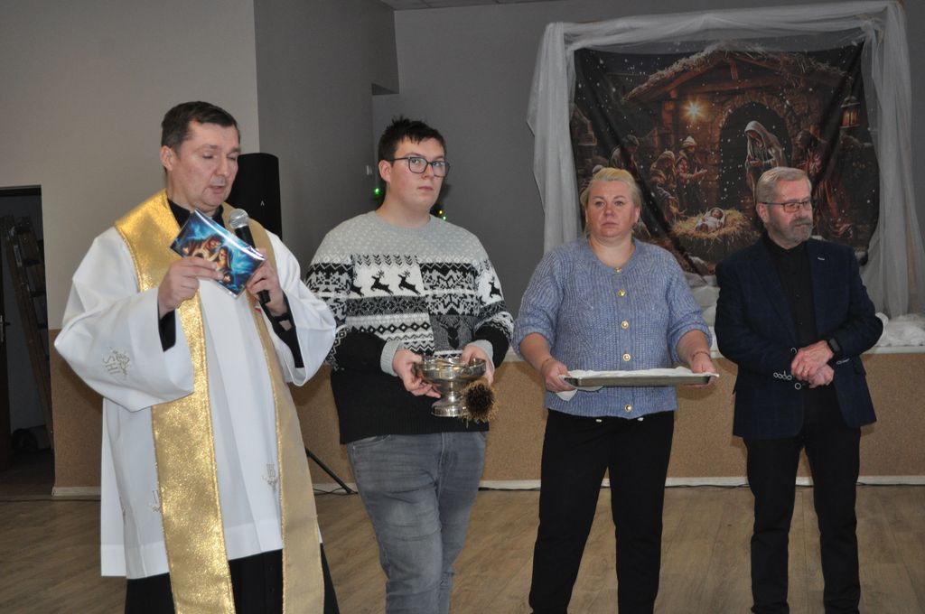 Uroczystość rozpoczął ks. proboszcz Tomasz Flajszer wspólną modlitwą i słowem Bożym z Ewangelii o Bożym Narodzeniu. Poświęcił opłatki, które przekazał zebranym, a wszyscy wzajemnie złożyli sobie życzenia i podzieli się opłatkami. Ks. proboszcz zaprosił gości do zastawionych ciastem stołów i do wspólnego kolędowania. Śpiew kolęd rozbrzmiewał radośnie do godzin wieczornych przy akompaniamencie organisty Kazimierza Cierpki i lektora Stasia Junyszka oraz akordeonisty Marcina Nowaka.