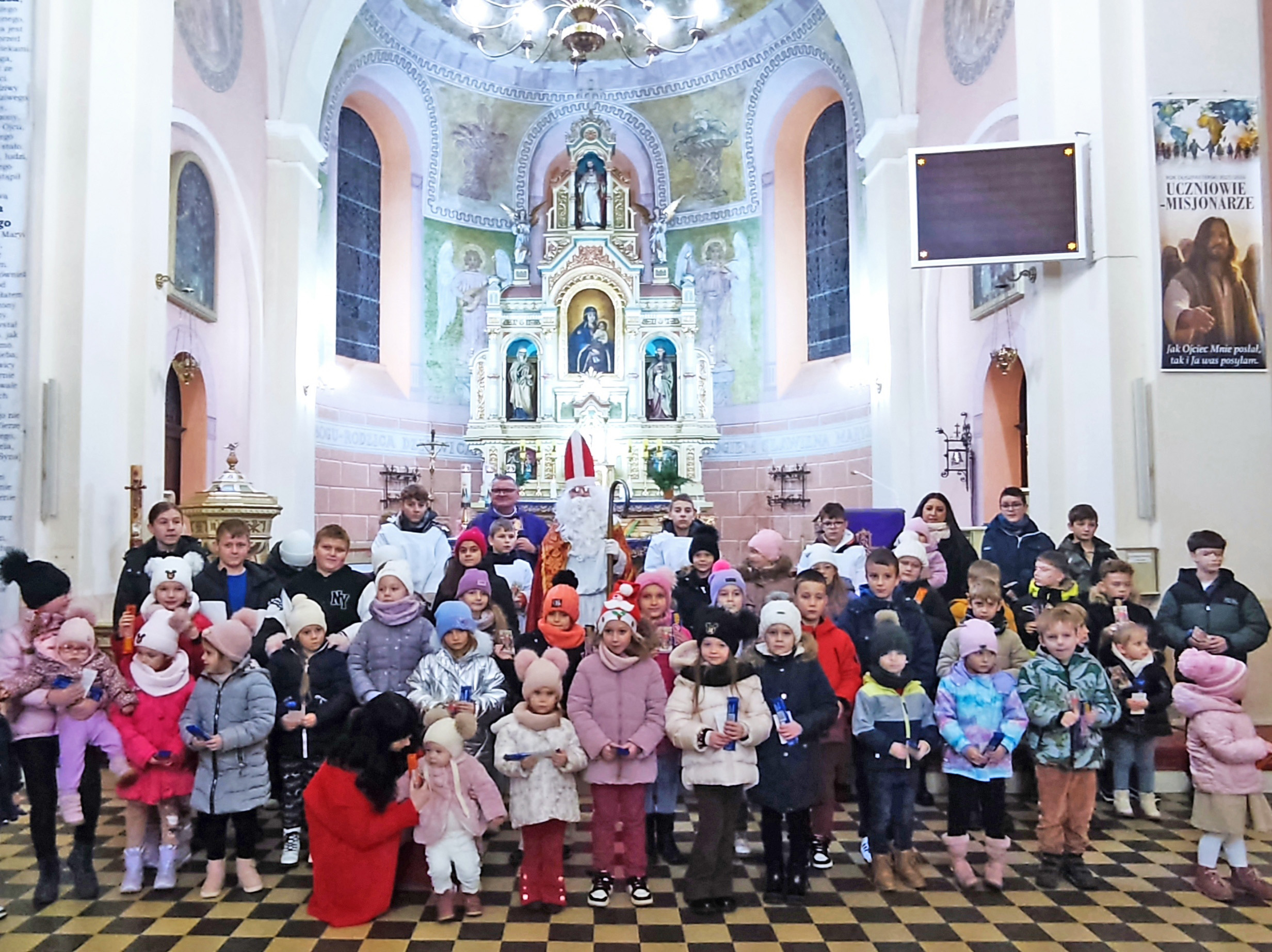 Ks. proboszcz Marek Czekaj, wprowadzając zebranych w atmosferę tego wyjątkowego dnia, przybliżył wszystkim sylwetkę prawdziwego św. Mikołaja - biskupa z Miry, człowieka wielkiego serca, którego dobroczynność i troska o potrzebujących stały się wzorem chrześcijańskiego życia. Dzięki jego słowom obecni mogli na nowo odkryć duchowy wymiar grudniowej tradycji. Dzieci chcąc udowodnić, że pamiętają o najważniejszym przesłaniu Świętego, z zapałem przystąpiły do krótkiego egzaminu ze znajomości modlitw. Wypadły „na szóstkę”, co z radością podkreślał sam św. Mikołaj, patrząc z dumą na młode serca wzrastające w wierze.