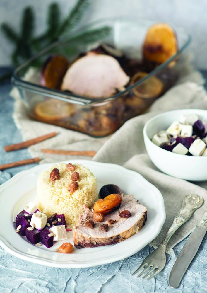 Szynkę podajemy z ugotowanym kuskusem i sałatką z buraków.