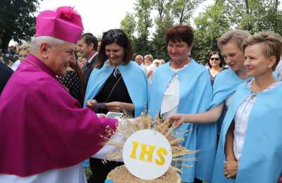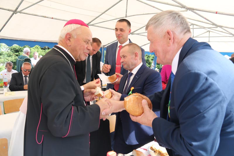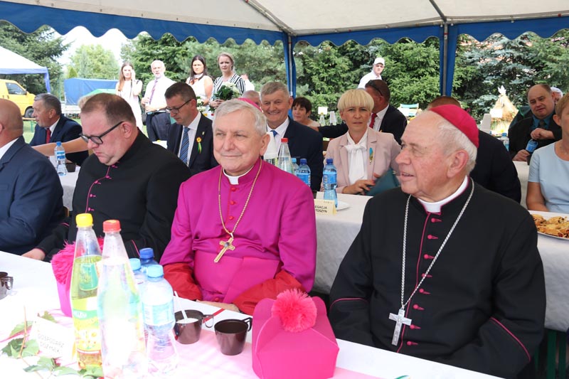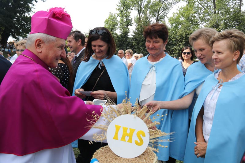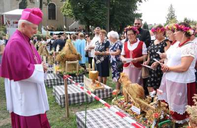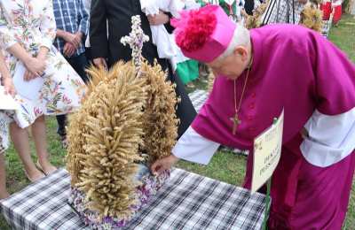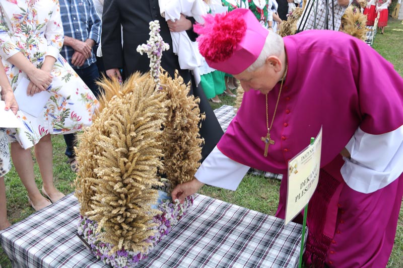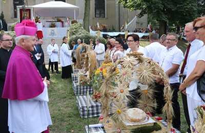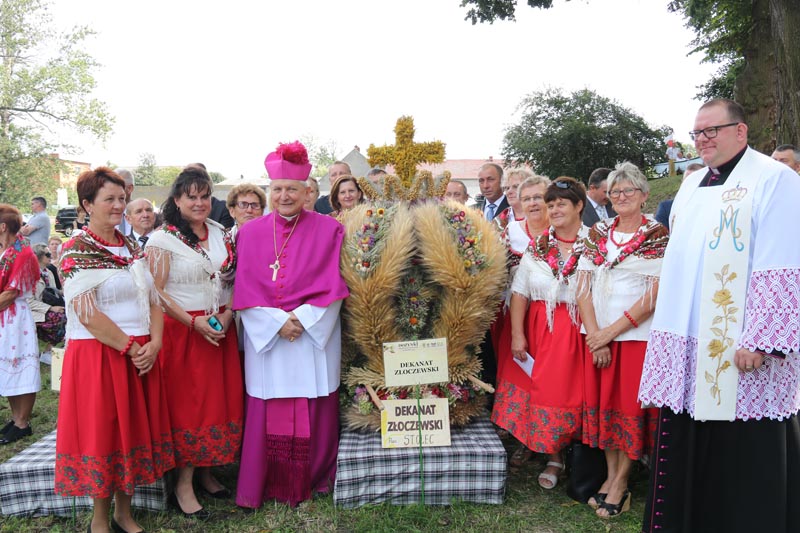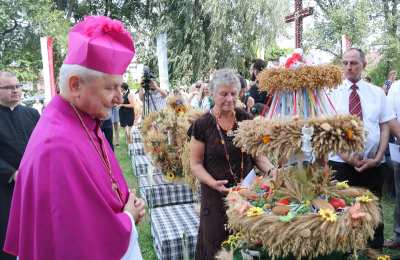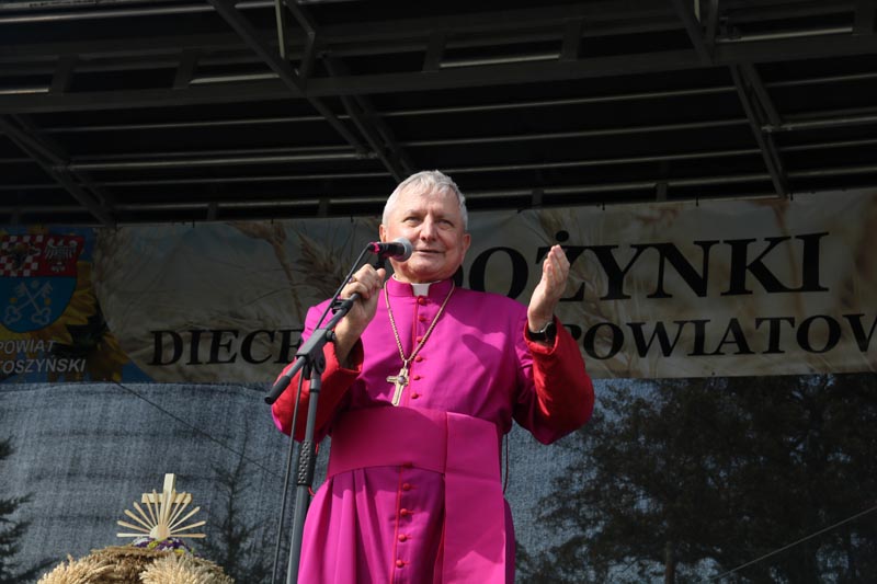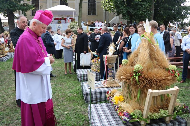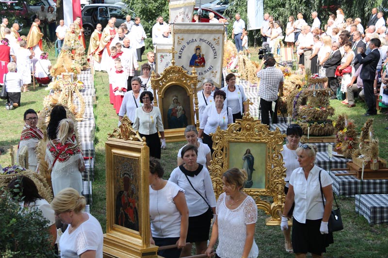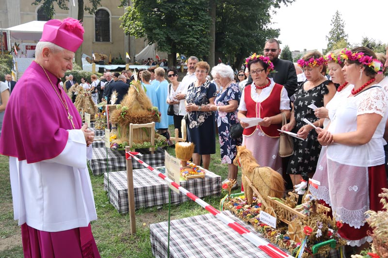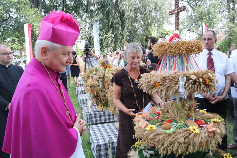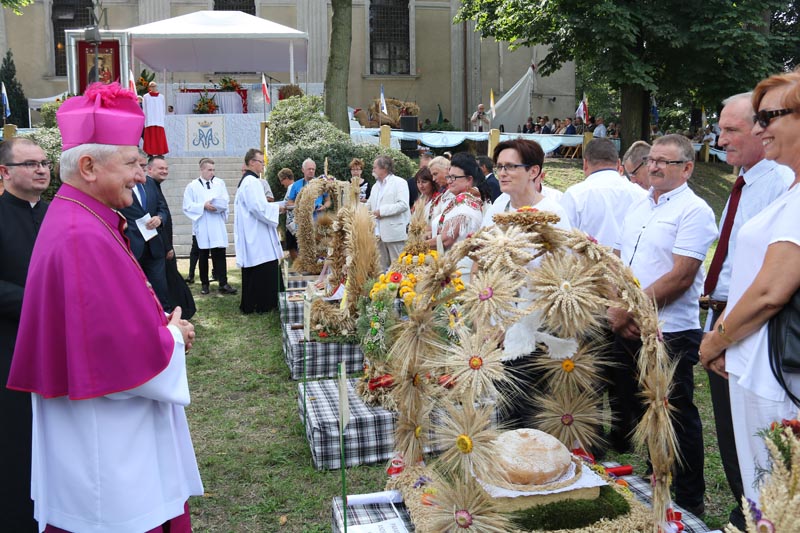 W homilii bp Stanisław Napierała przypomniał, że 20 lat temu dokonano koronacji obrazu Matki Bożej Pocieszenia. – Na Jej skronie oraz na skronie Bożego Dziecięcia, które trzyma na ręce, zostały nałożone złote korony, uprzednio poświęcone przez Ojca Świętego Jana Pawła II. Była to druga taka uroczystość w nowej diecezji. Pierwsza odbyła się w Twardogórze w 1995 roku, gdzie uczciliśmy Najświętszą Maryję w znaku figury Wspomożycielki Wiernych – wspominał Kaznodzieja. Wskazywał, że dożynki są okazją do wyrażenia wdzięczności dla rolników, ogrodników oraz sadowników i symbolizują ich wysiłek. Podkreślał, że w każdym roku rolnicy doświadczają skutków uzależnienia od pogody. Dodał, że w tym roku w wielu regionach dała się we znaki susza. – W imieniu dotkniętych suszą ośmielam się skierować do Was Szanowni Państwo, którym naród powierzył władzę i troskę o nasz kraj: pospieszcie ludziom pracy na roli z realną pomocą. Parafrazując słowa Ewangelii, by miłować nie słowem, lecz czynem proszę słów oszczędzajcie, czynów przymnóżcie – mówił Celebrans.