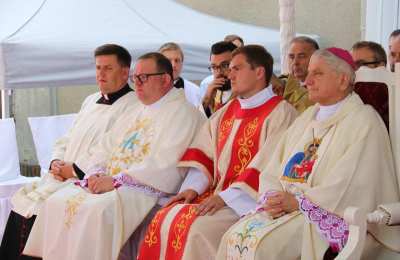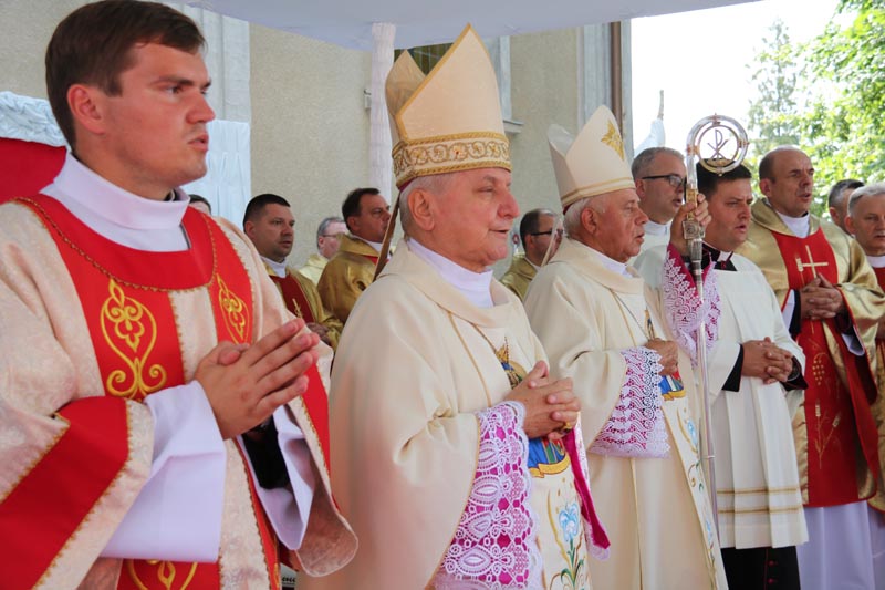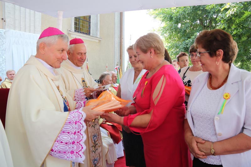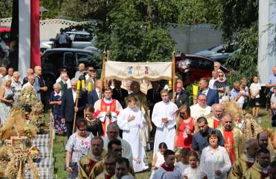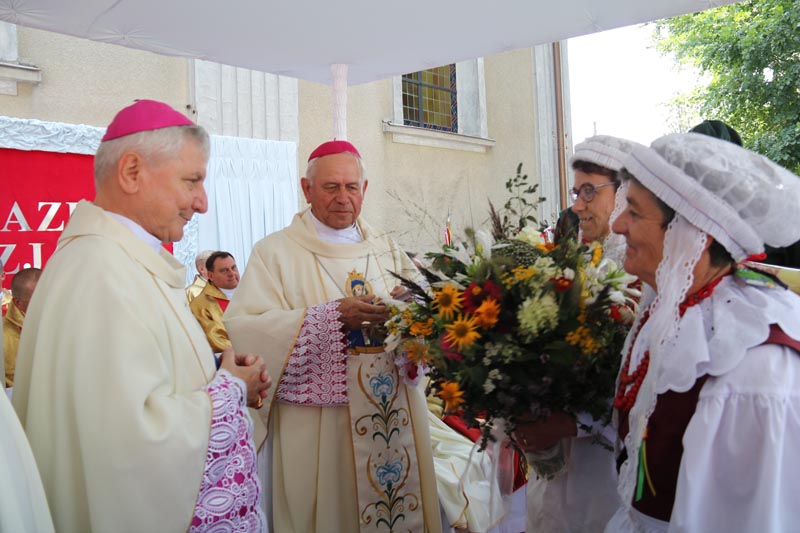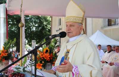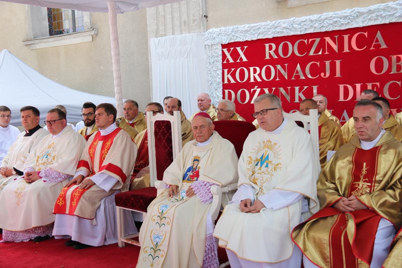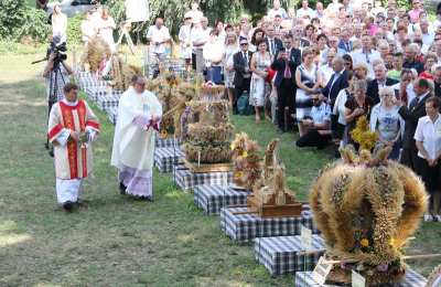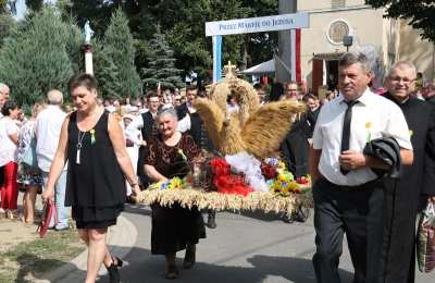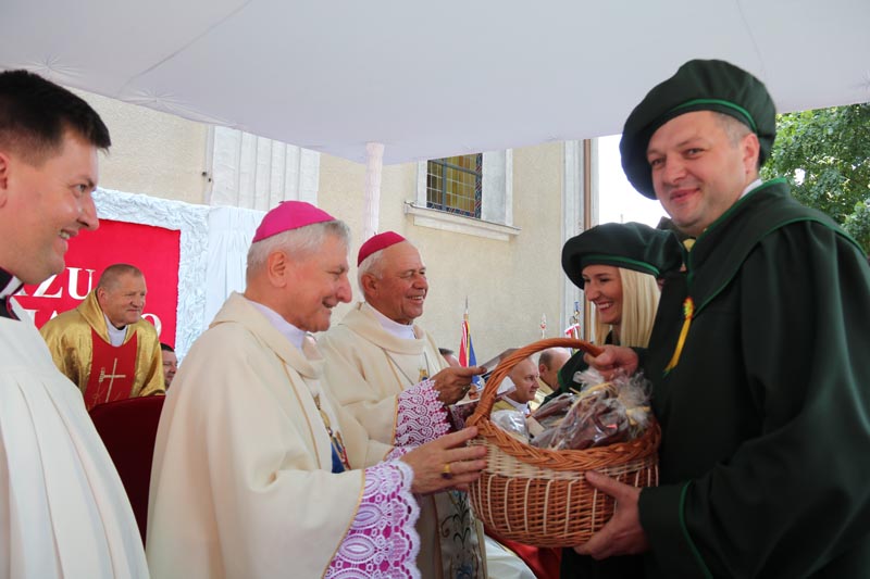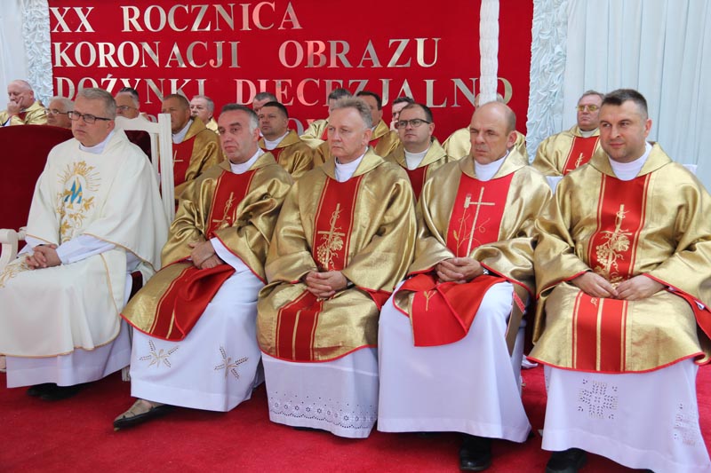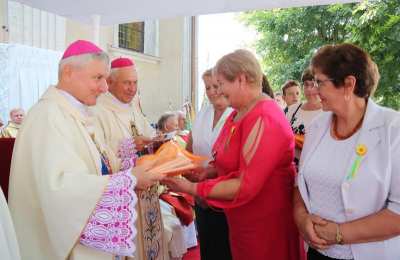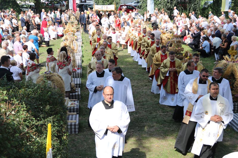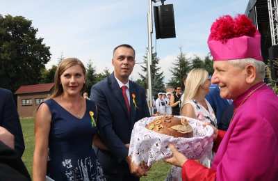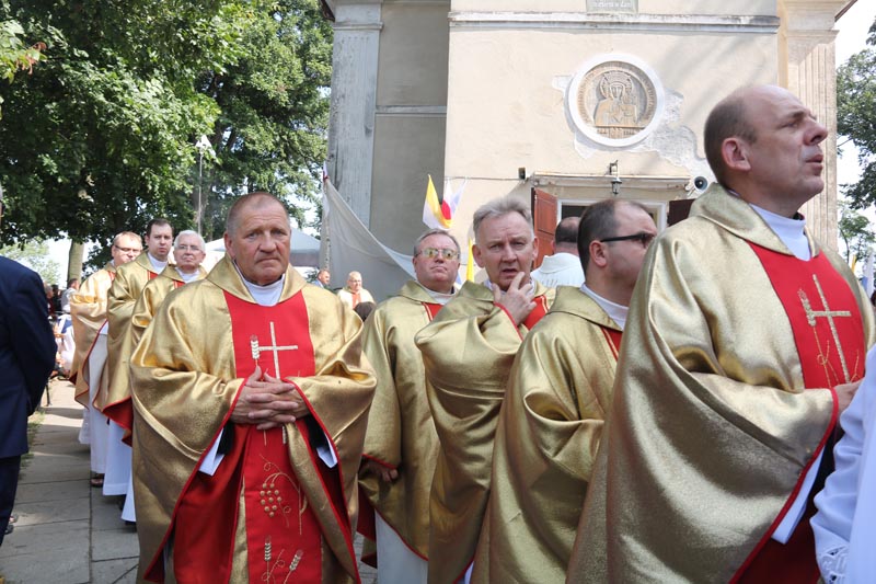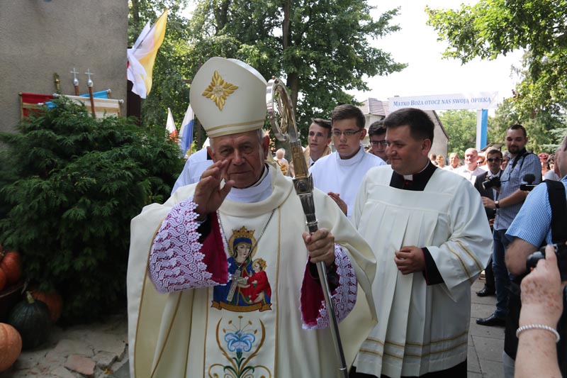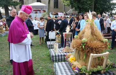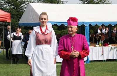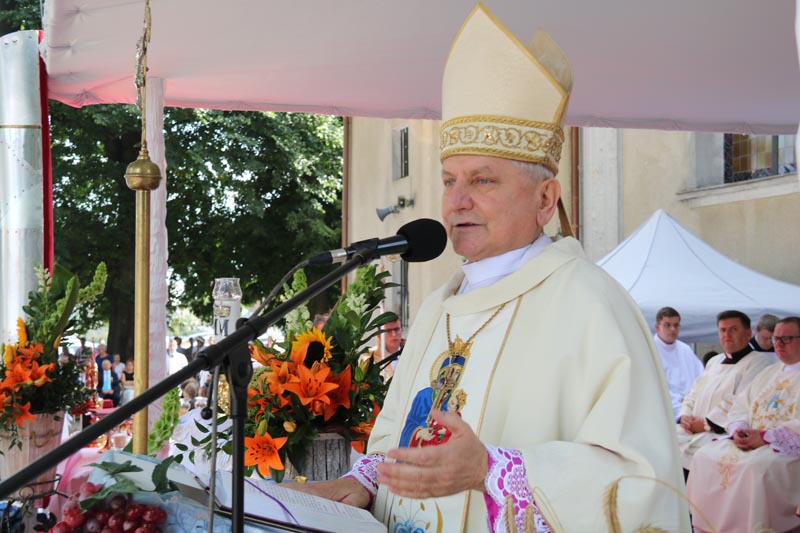 W homilii bp Stanisław Napierała przypomniał, że 20 lat temu dokonano koronacji obrazu Matki Bożej Pocieszenia. – Na Jej skronie oraz na skronie Bożego Dziecięcia, które trzyma na ręce, zostały nałożone złote korony, uprzednio poświęcone przez Ojca Świętego Jana Pawła II. Była to druga taka uroczystość w nowej diecezji. Pierwsza odbyła się w Twardogórze w 1995 roku, gdzie uczciliśmy Najświętszą Maryję w znaku figury Wspomożycielki Wiernych – wspominał Kaznodzieja. Wskazywał, że dożynki są okazją do wyrażenia wdzięczności dla rolników, ogrodników oraz sadowników i symbolizują ich wysiłek. Podkreślał, że w każdym roku rolnicy doświadczają skutków uzależnienia od pogody. Dodał, że w tym roku w wielu regionach dała się we znaki susza. – W imieniu dotkniętych suszą ośmielam się skierować do Was Szanowni Państwo, którym naród powierzył władzę i troskę o nasz kraj: pospieszcie ludziom pracy na roli z realną pomocą. Parafrazując słowa Ewangelii, by miłować nie słowem, lecz czynem proszę słów oszczędzajcie, czynów przymnóżcie – mówił Celebrans.