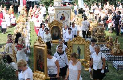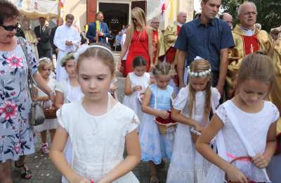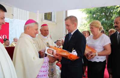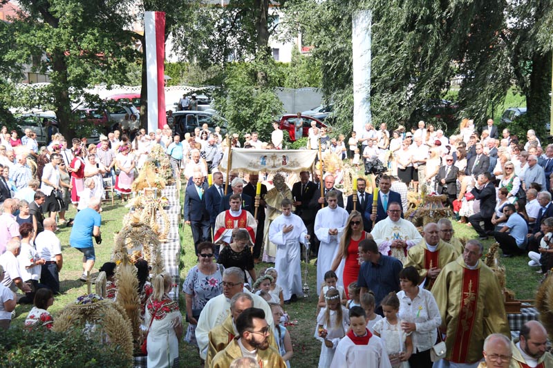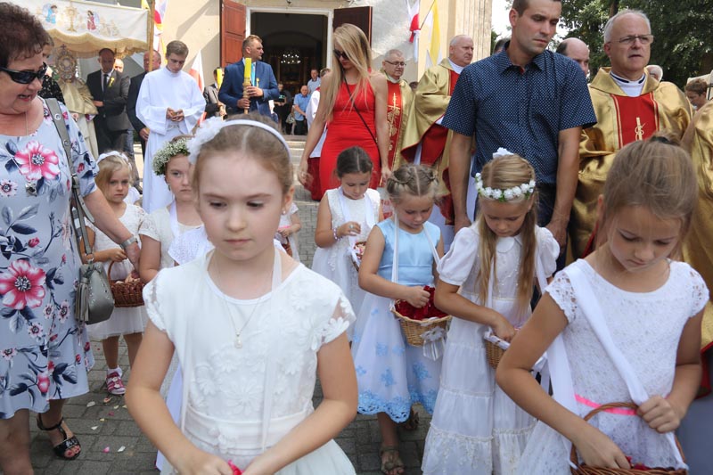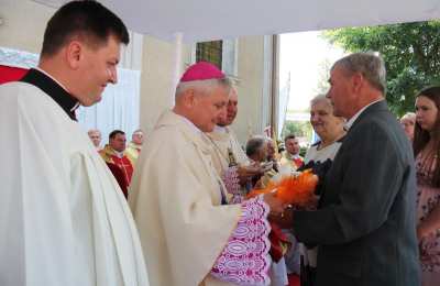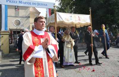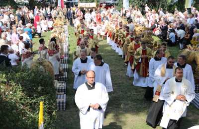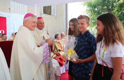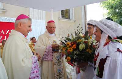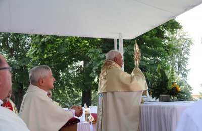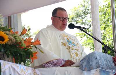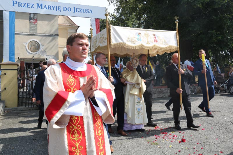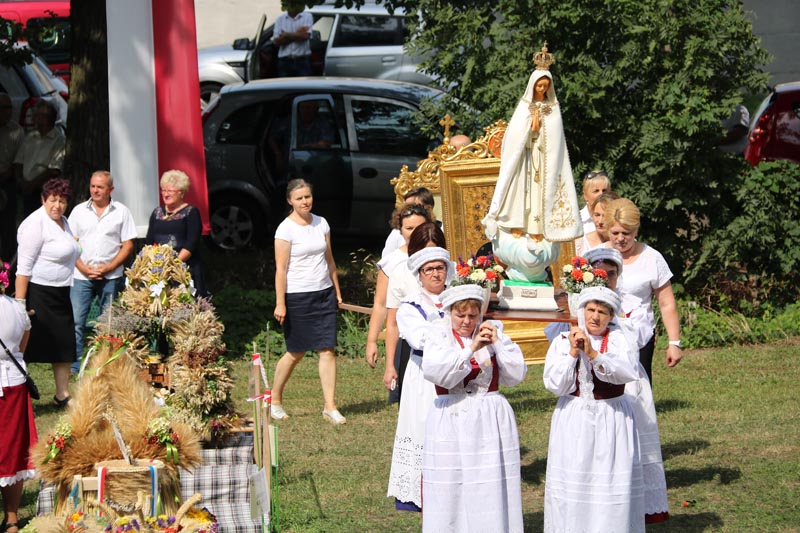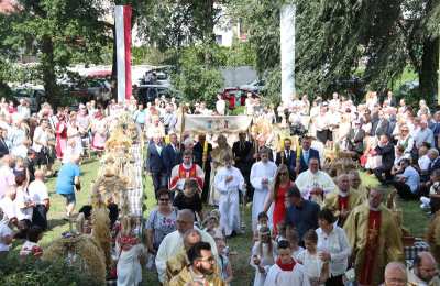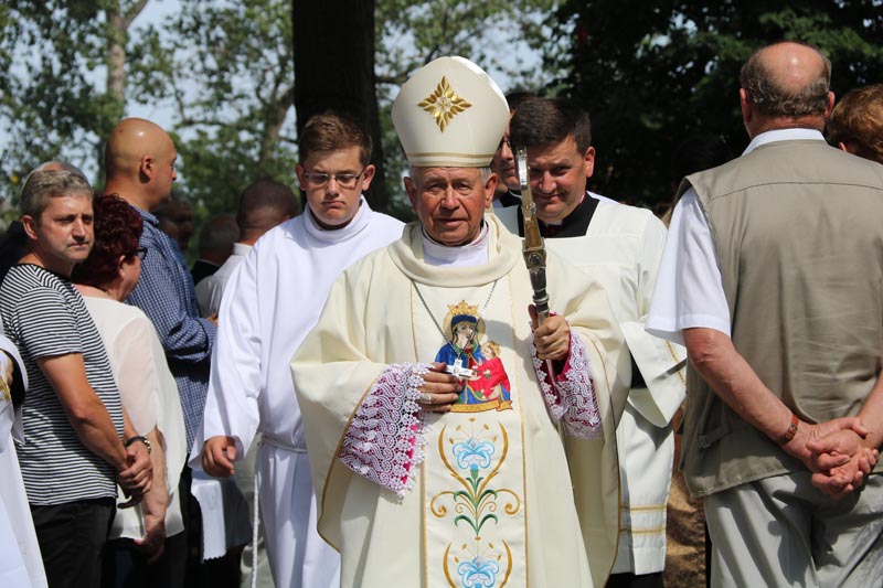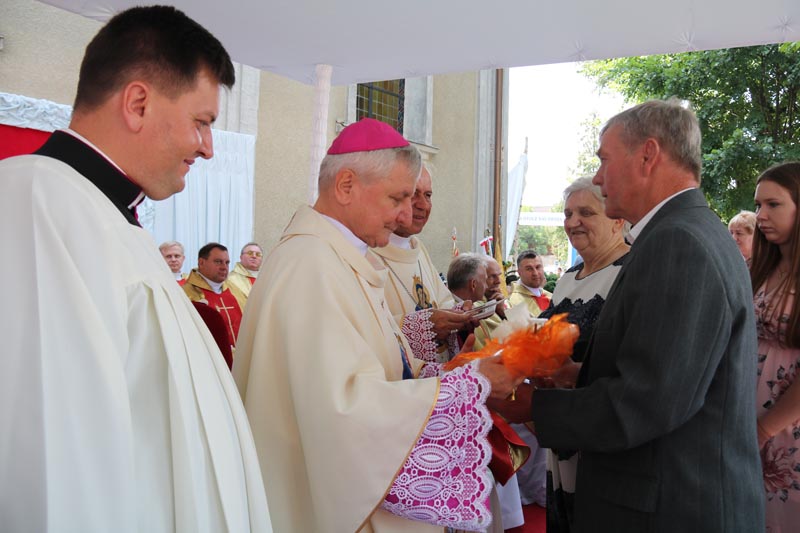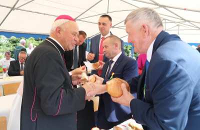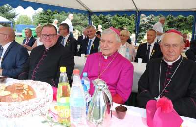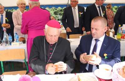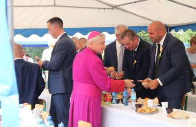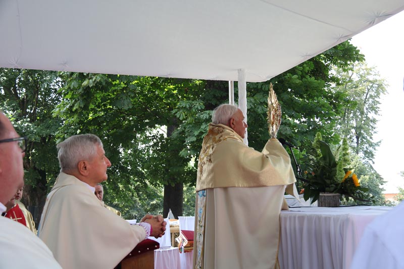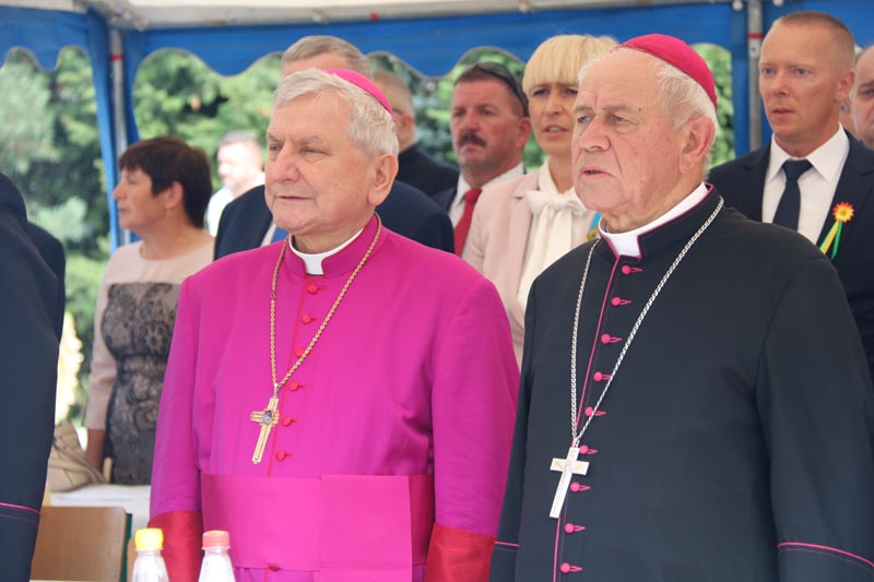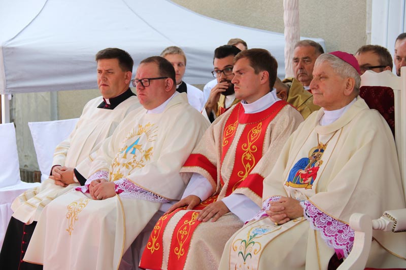 W homilii bp Stanisław Napierała przypomniał, że 20 lat temu dokonano koronacji obrazu Matki Bożej Pocieszenia. – Na Jej skronie oraz na skronie Bożego Dziecięcia, które trzyma na ręce, zostały nałożone złote korony, uprzednio poświęcone przez Ojca Świętego Jana Pawła II. Była to druga taka uroczystość w nowej diecezji. Pierwsza odbyła się w Twardogórze w 1995 roku, gdzie uczciliśmy Najświętszą Maryję w znaku figury Wspomożycielki Wiernych – wspominał Kaznodzieja. Wskazywał, że dożynki są okazją do wyrażenia wdzięczności dla rolników, ogrodników oraz sadowników i symbolizują ich wysiłek. Podkreślał, że w każdym roku rolnicy doświadczają skutków uzależnienia od pogody. Dodał, że w tym roku w wielu regionach dała się we znaki susza. – W imieniu dotkniętych suszą ośmielam się skierować do Was Szanowni Państwo, którym naród powierzył władzę i troskę o nasz kraj: pospieszcie ludziom pracy na roli z realną pomocą. Parafrazując słowa Ewangelii, by miłować nie słowem, lecz czynem proszę słów oszczędzajcie, czynów przymnóżcie – mówił Celebrans.
