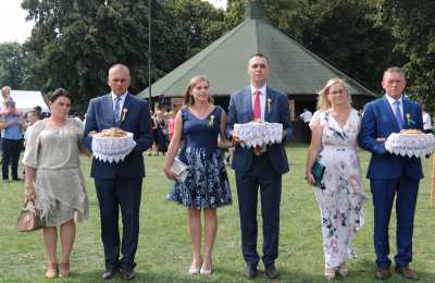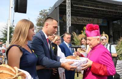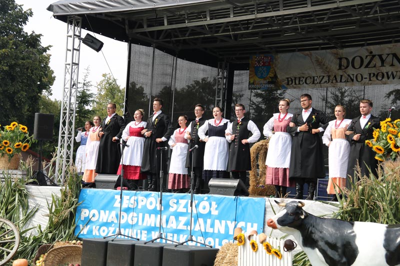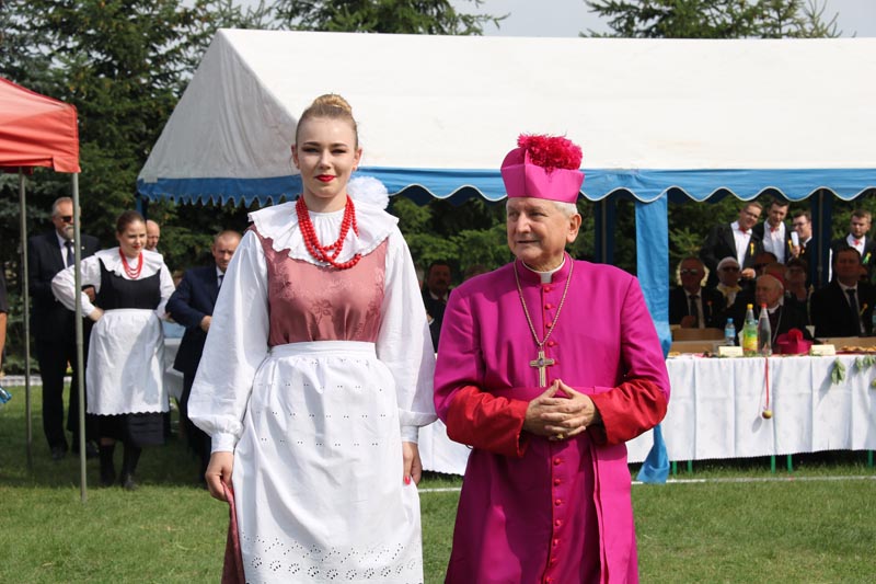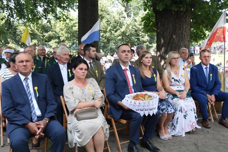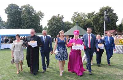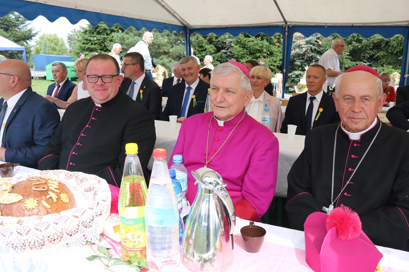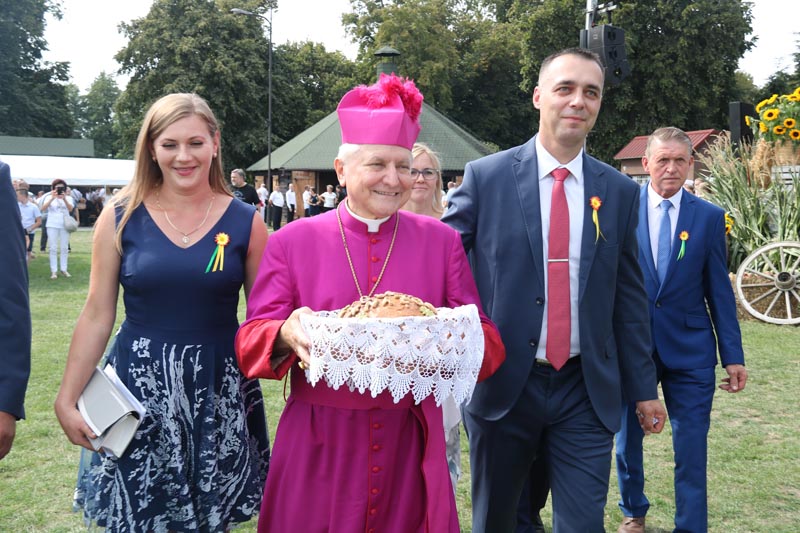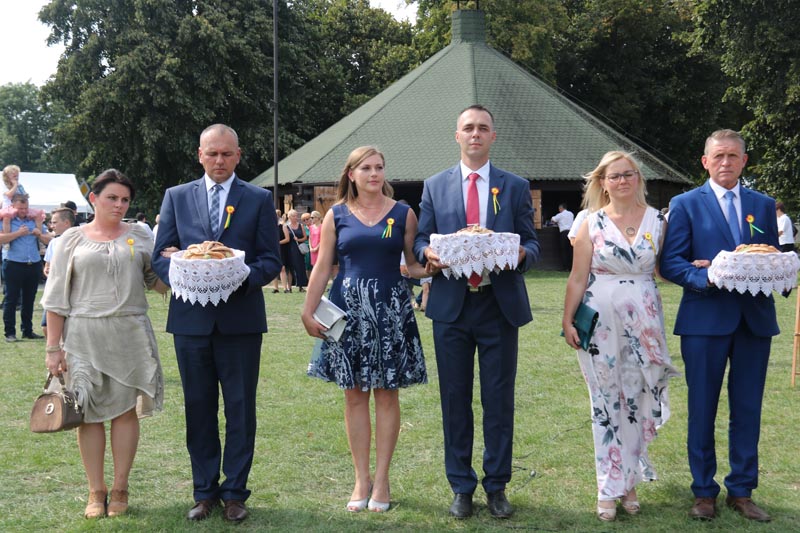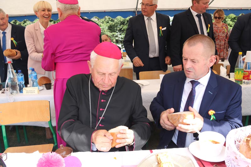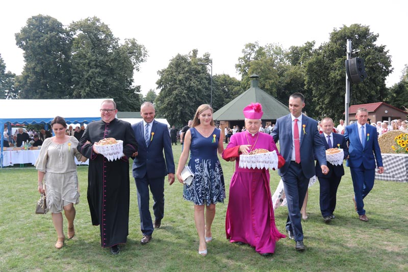 Po Eucharystii korowód dożynkowy przeszedł na teren boiska przy Grzybku, gdzie młodzież z Zespołu Szkół Ponadgimnazjalnych z Koźmina Wielkopolskiego rozpoczęła obrzęd dożynkowy. Starostowie dożynek: Monika i Karol Grzeszczuk z Rudy w gminie Zduny oraz starostowie pomocniczy Agnieszka Kaj i Jan Jaskuła z Lutogniewa oraz Małgorzata Ziętek z Fijałowa i Bronisław Koncewicz z Długołęki w gminie Kobylin złożyli bochenki chleba na ręce biskupa kaliskiego Edwarda Janiaka, kustosza Sanktuarium Matki Bożej Pocieszenia w Lutogniewie ks. kanonika Łukasza Żurawskiego i starosty krotoszyńskiego Stanisława Szczotki. W swoim wystąpieniu Biskup kaliski prosił, aby młode pokolenia uczyć miłości do ziemi. – Dzisiaj trzeba mówić dzieciom i wnukom o przodkach. Trzeba uczyć miłości do ojczyzny. Dzisiaj, kiedy jesteśmy w Europie i napływają do nas te wszystkie trendy, również negatywne, to bardzo ważne jest, aby pielęgnować wiarę, uczyć modlitwy. W tej wielkiej Europie jesteśmy taką gwiazdą nadziei tradycji, świętości, miłości do Kościoła i ojczyzny – powiedział bp Edward. Rolnikom za pracę dziękował starosta krotoszyński Stanisław Szczotka, który swoje wystąpienie rozpoczął od słów „starostą się bywa, a rolnikiem się jest”.