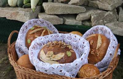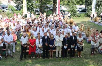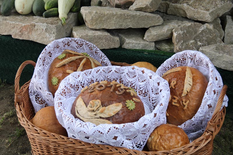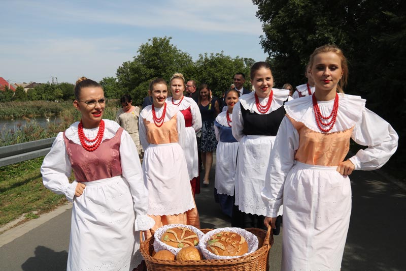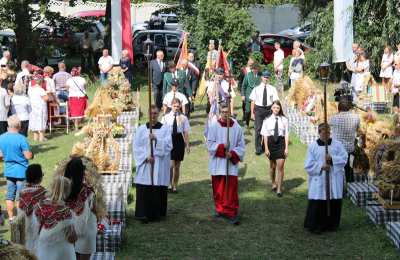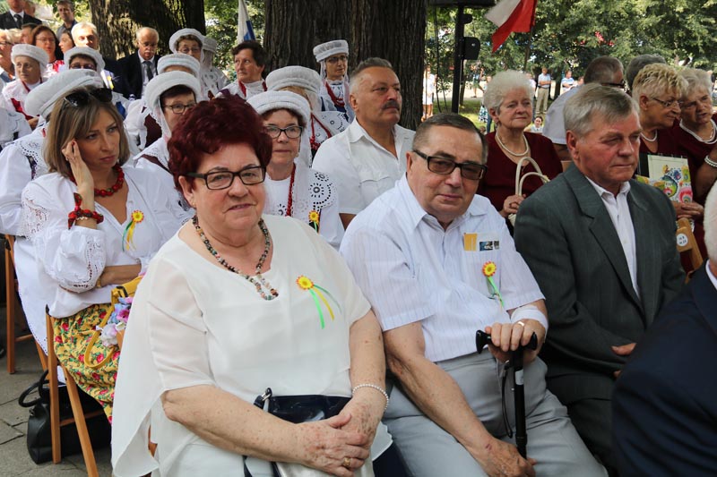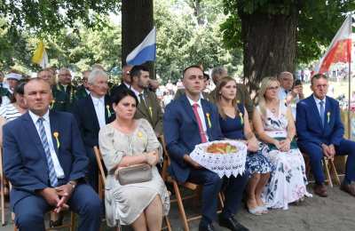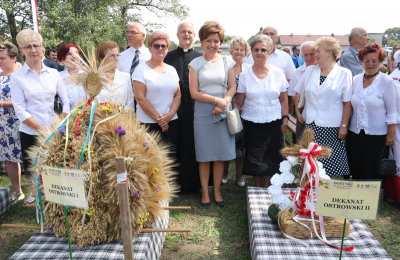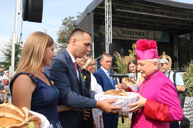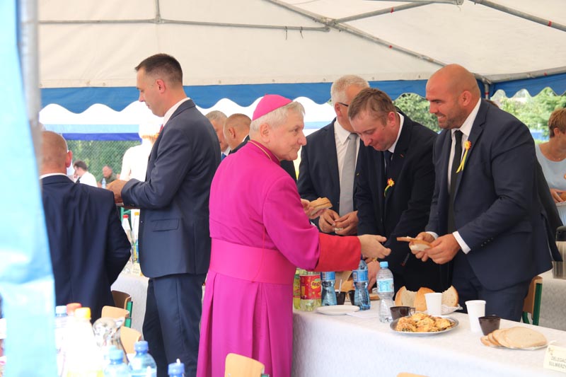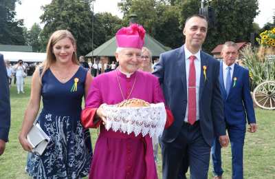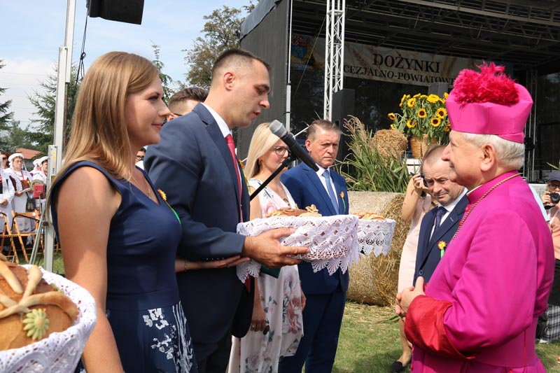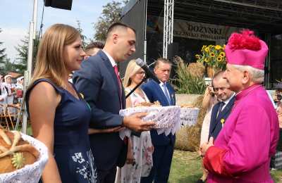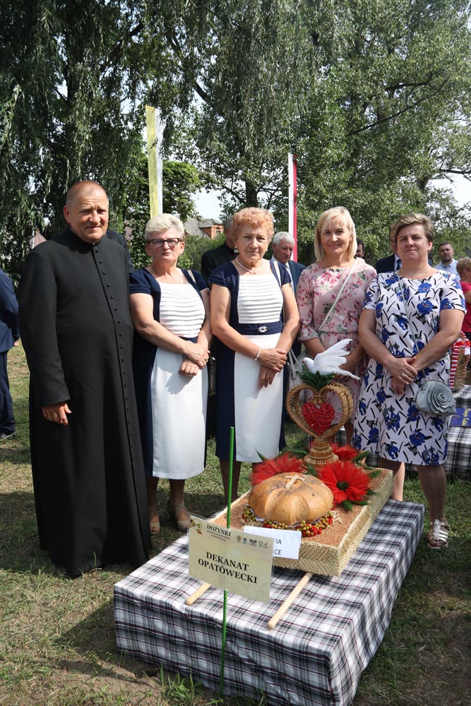 Po Eucharystii korowód dożynkowy przeszedł na teren boiska przy Grzybku, gdzie młodzież z Zespołu Szkół Ponadgimnazjalnych z Koźmina Wielkopolskiego rozpoczęła obrzęd dożynkowy. Starostowie dożynek: Monika i Karol Grzeszczuk z Rudy w gminie Zduny oraz starostowie pomocniczy Agnieszka Kaj i Jan Jaskuła z Lutogniewa oraz Małgorzata Ziętek z Fijałowa i Bronisław Koncewicz z Długołęki w gminie Kobylin złożyli bochenki chleba na ręce biskupa kaliskiego Edwarda Janiaka, kustosza Sanktuarium Matki Bożej Pocieszenia w Lutogniewie ks. kanonika Łukasza Żurawskiego i starosty krotoszyńskiego Stanisława Szczotki. W swoim wystąpieniu Biskup kaliski prosił, aby młode pokolenia uczyć miłości do ziemi. – Dzisiaj trzeba mówić dzieciom i wnukom o przodkach. Trzeba uczyć miłości do ojczyzny. Dzisiaj, kiedy jesteśmy w Europie i napływają do nas te wszystkie trendy, również negatywne, to bardzo ważne jest, aby pielęgnować wiarę, uczyć modlitwy. W tej wielkiej Europie jesteśmy taką gwiazdą nadziei tradycji, świętości, miłości do Kościoła i ojczyzny – powiedział bp Edward. Rolnikom za pracę dziękował starosta krotoszyński Stanisław Szczotka, który swoje wystąpienie rozpoczął od słów „starostą się bywa, a rolnikiem się jest”.