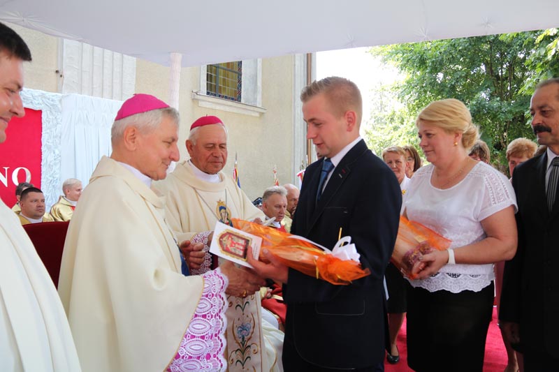 Do Lutogniewa przybył biskup kaliski Edward Janiak, który przed Eucharystią obejrzał wieńce dożynkowe przywiezione przez delegacje rolników z trzydziestu trzech dekanatów diecezji kaliskiej. Biskup podziwiał trud pracy, który rolnicy włożyli w przygotowanie wieńców. Punktem centralnym uroczystości była Msza św. dziękczynna pod przewodnictwem pierwszego biskupa kaliskiego Stanisława Napierały. Wraz z nim modlili się biskup kaliski Edward Janiak, ks. kanonik Łukasz Żurawski, kustosz lutogniewskiego sanktuarium oraz liczni kapłani. W swoim słowie Ks. Biskup Edward wspominał, że 20 lat temu jako Biskup pomocniczy archidiecezji wrocławskiej uczestniczył w uroczystości koronacji obrazu Matki Bożej Pocieszenia. – Księże Biskupie Stanisławie to Twoim staraniem te korony otrzymała wtedy Matka Boża – powiedział Pasterz naszej diecezji. Biskup poświęcił nowy dach świątyni wyrażając wdzięczność Proboszczowi parafii i władzom samorządowym za wsparcie tego dzieła. Poświęcone zostały także wieńce dożynkowe.