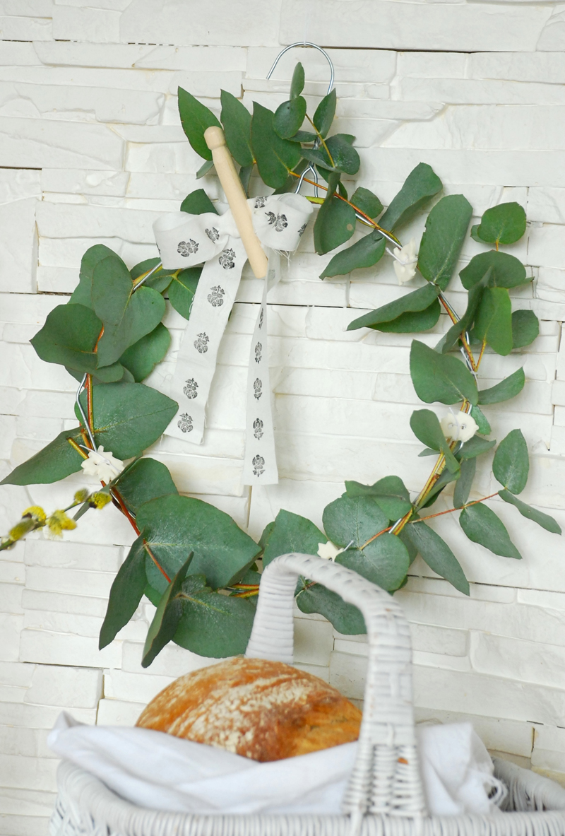 Wianki są piękną i prostą ozdobą mieszkania. Przy świątecznych okazjach (także chrztu i Pierwszej Komunii) przygotowuję takich wiele, dużych i małych. Malowniczo dekorują drzwi, okna i stoły. Do ich wykonania najlepiej wykorzystać rośliny, które ładnie zasychają. Jedną z nich jest eukaliptus, który po wyschnięciu nie traci koloru, a dodatkowo wydziela przyjemny zapach. Można go spotkać w kwiaciarniach w różnych odmianach, liście mają różne kształty i wielkości. Dodatkowo eukaliptus ma bardzo elastyczne gałązki, z których łatwo formować wianek. Do ozdobienia wianka można wykorzystać tasiemki, guziki lub typowe wielkanocne ozdoby. Na tym ze zdjęcia widać tasiemki z poprzedniego numeru „Opiekuna” i ozdoby z masy plastycznej, które pokazywałam w numerze listopadowym. Można wykonać takie w kształcie jajek, motylków czy ptaków i poprosić dzieci o kolorowanie. Klamerki, które kiedyś służyły do przypinania bielizny na sznurach są obecnie łatwo dostępne w sklepach papierniczych jako element ozdobny. Już same zielone gałązki wyglądają efektownie, reszta zależy od naszych upodobań i chęci.