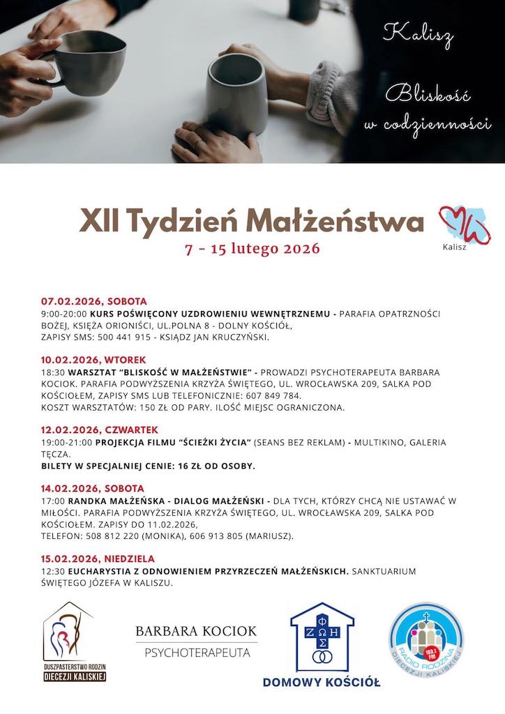 • Warsztaty „Bliskość w małżeństwie” we wtorek o g. 18.30 w sali konferencyjnej dolnego kościoła w Kaliszu-Szczypiornie.