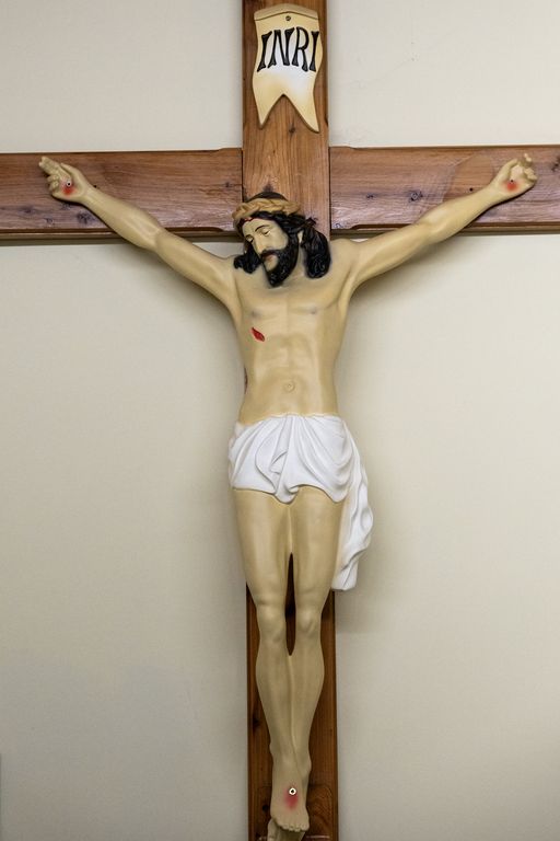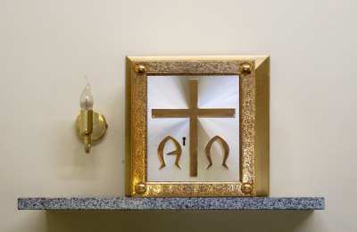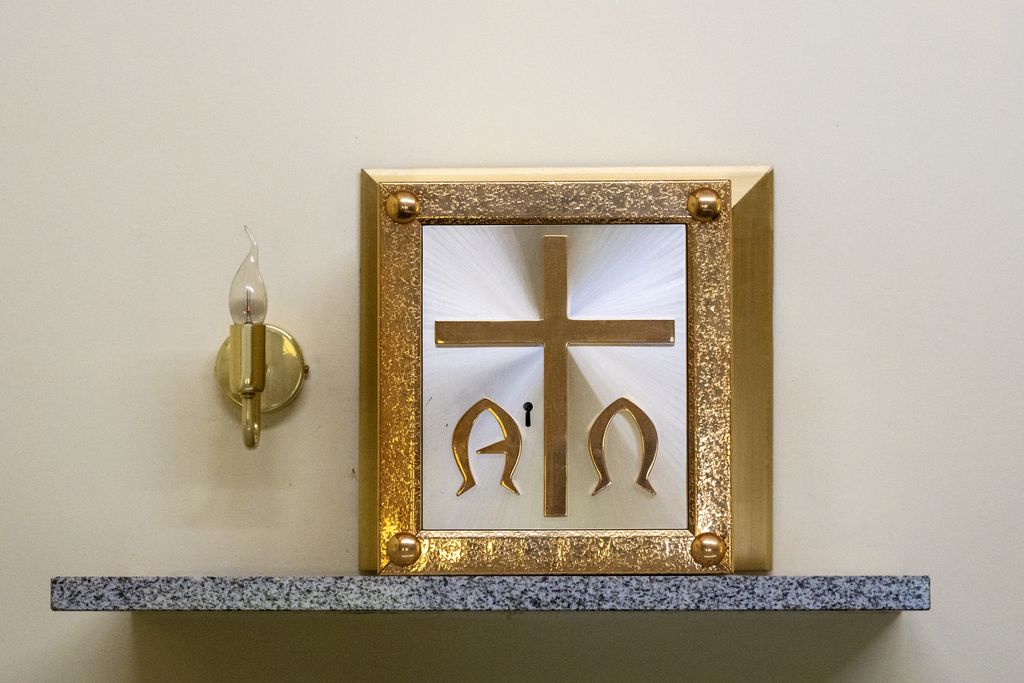 Po bokach ołtarza na postumentach ustawione są figury, ta po prawej przedstawia Jezusa wskazującego na swoje serce, a po przeciwnej stronie znajdziemy jego Najświętszą Maryję Pannę. Na bocznej ścianie kaplicy zobaczymy kolejną figurę, która przedstawia św. Antoniego. Przed ołtarzem postumenty na trumnę z doczesnymi szczątkami tych, których w tym miejscu żegnają najbliżsi.