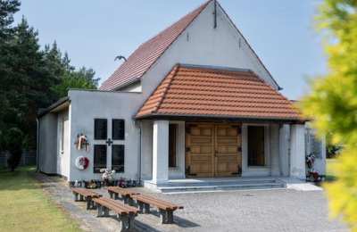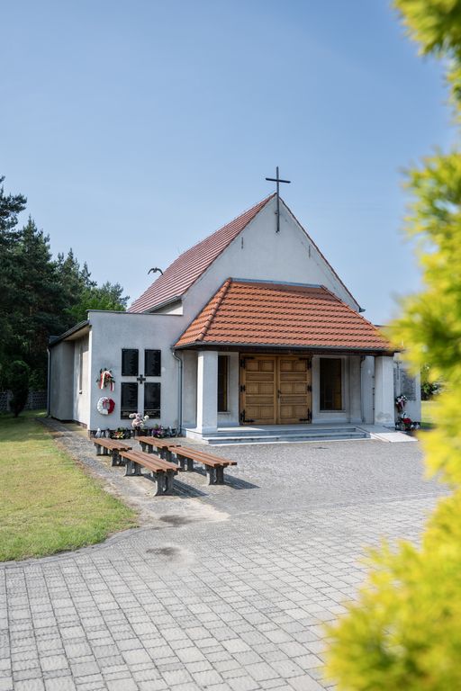 Wspominając te postacie i wskazując na tablice, które znajdują się na ścianach frontowych kaplicy cmentarnej chcę w tym materiale o niej właśnie kilka zdań napisać. Kaplica nosi wezwanie pw. Podwyższenia Krzyża Świętego. Jest to budynek murowany, pokryty dwuspadowym dachem, nad wejściem do kaplicy również znajduje się daszek. Jej wnętrze choć surowe daje poczucie wyciszenia i ukojenia. Chyba właśnie o takie odczucia chodzi w takich miejscach. Wzrok skupia na sobie Chrystus zawieszony na krzyżu w centrum ołtarza. Tuż obok krzyża znajduje się tabernakulum.