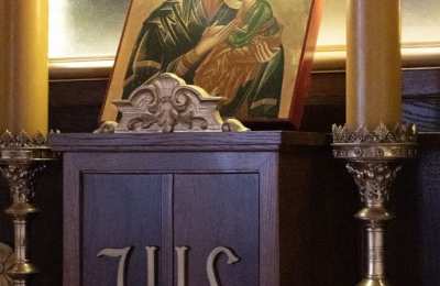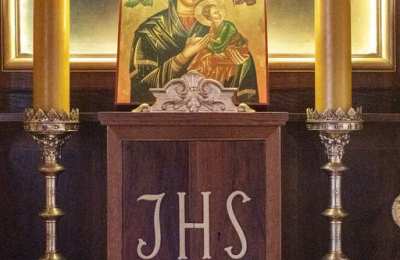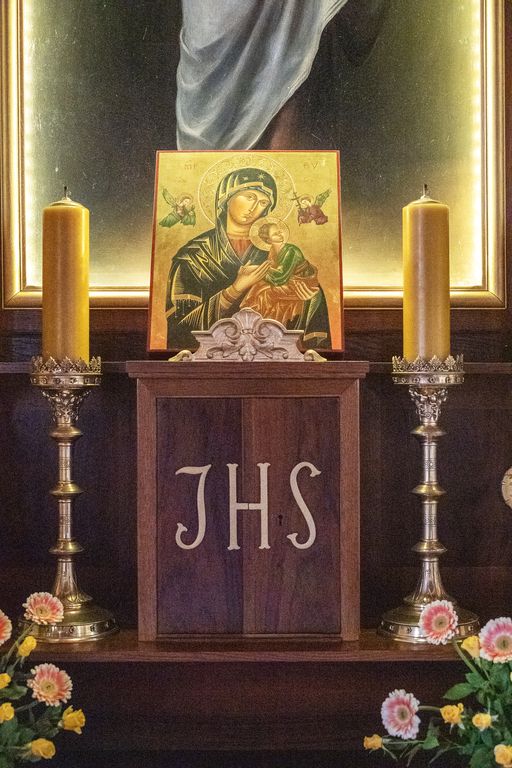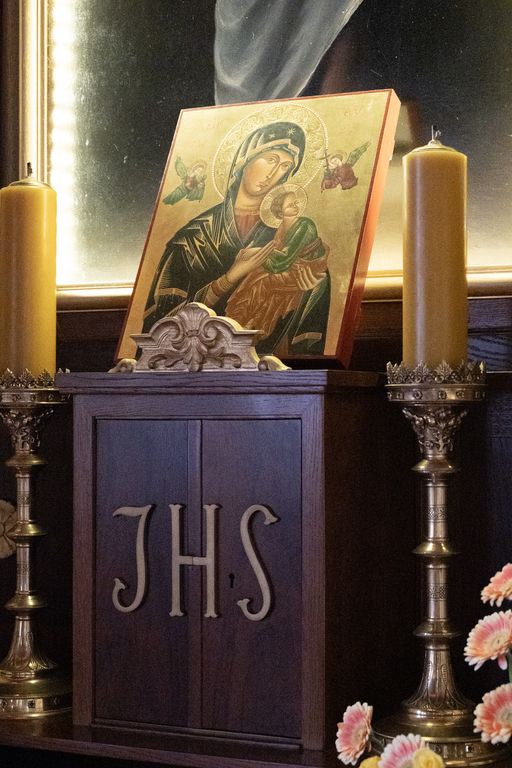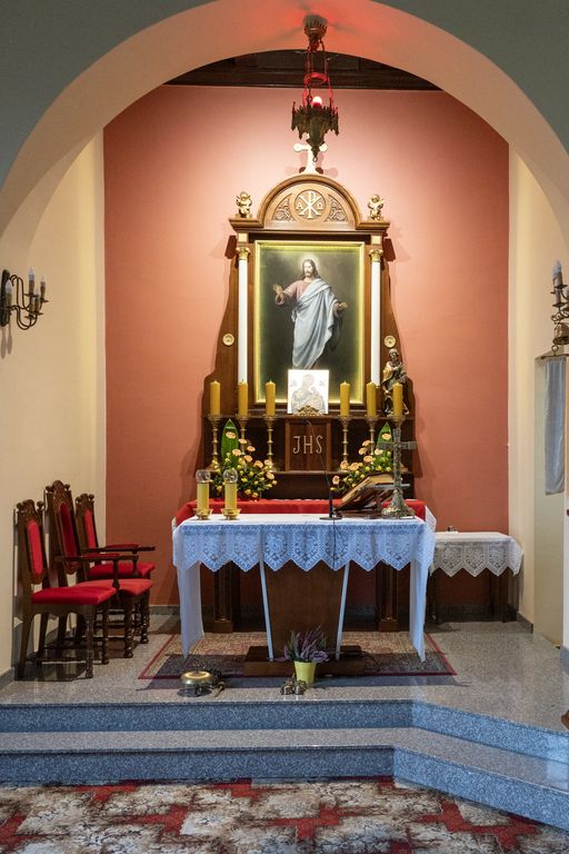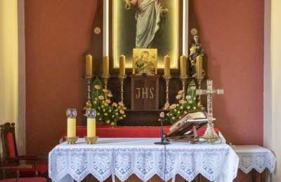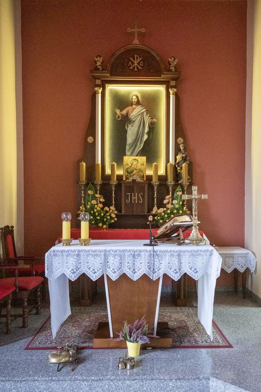 Tyle z zewnątrz. Natomiast, wchodząc do środka nasz wzrok, jak zawsze biegnie w stronę ołtarza głównego. Tutaj w jego centrum znajduje się obraz Jezusa Chrystusa Zbawiciela. Chrystus przedstawiony jest w pozycji stojącej z rozłożonymi rękami. Jest to niewielki ołtarz zwieńczony krzyżem, a po bokach na zwieńczeniu kolumn umieszczone są dwa aniołki. Pod obrazem Zbawiciela znajduje się tabernakulum. Odwracając wzrok i spoglądając na świątynię, poza okazałym chórem zobaczymy po lewej stronie ambonę, a po obu stronach przy oknach figury świętych stojące na małych postumentach. Jednym z nich jest św. Antoni Padewski, a drugi to św. Alojzy Gonzaga.