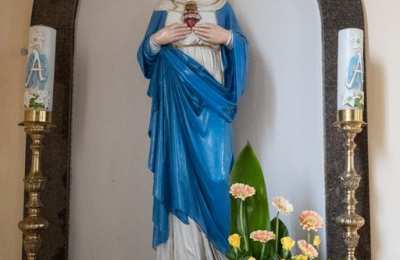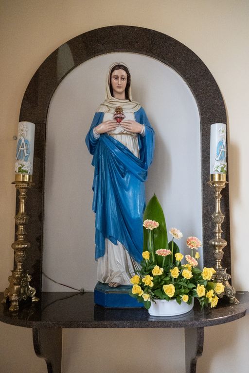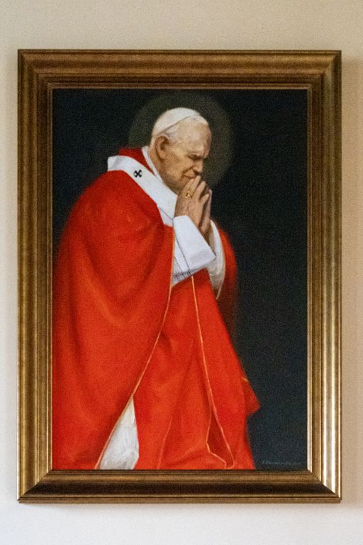 Należy jeszcze zauważyć, że w ołtarzu bocznym umieszczona jest gipsowa figura Niepokalanego Poczęcia Najświętszej Maryi Panny. Poza tym w kościele znajdziemy obrazy przedstawiające św. Jana Pawła II i rozmieszczone na ścianach bocznych stacje Drogi krzyżowej. Kończąc opis świątyni, skieruję wasz wzrok na jej sklepienie, które wykonane jest z drewna.